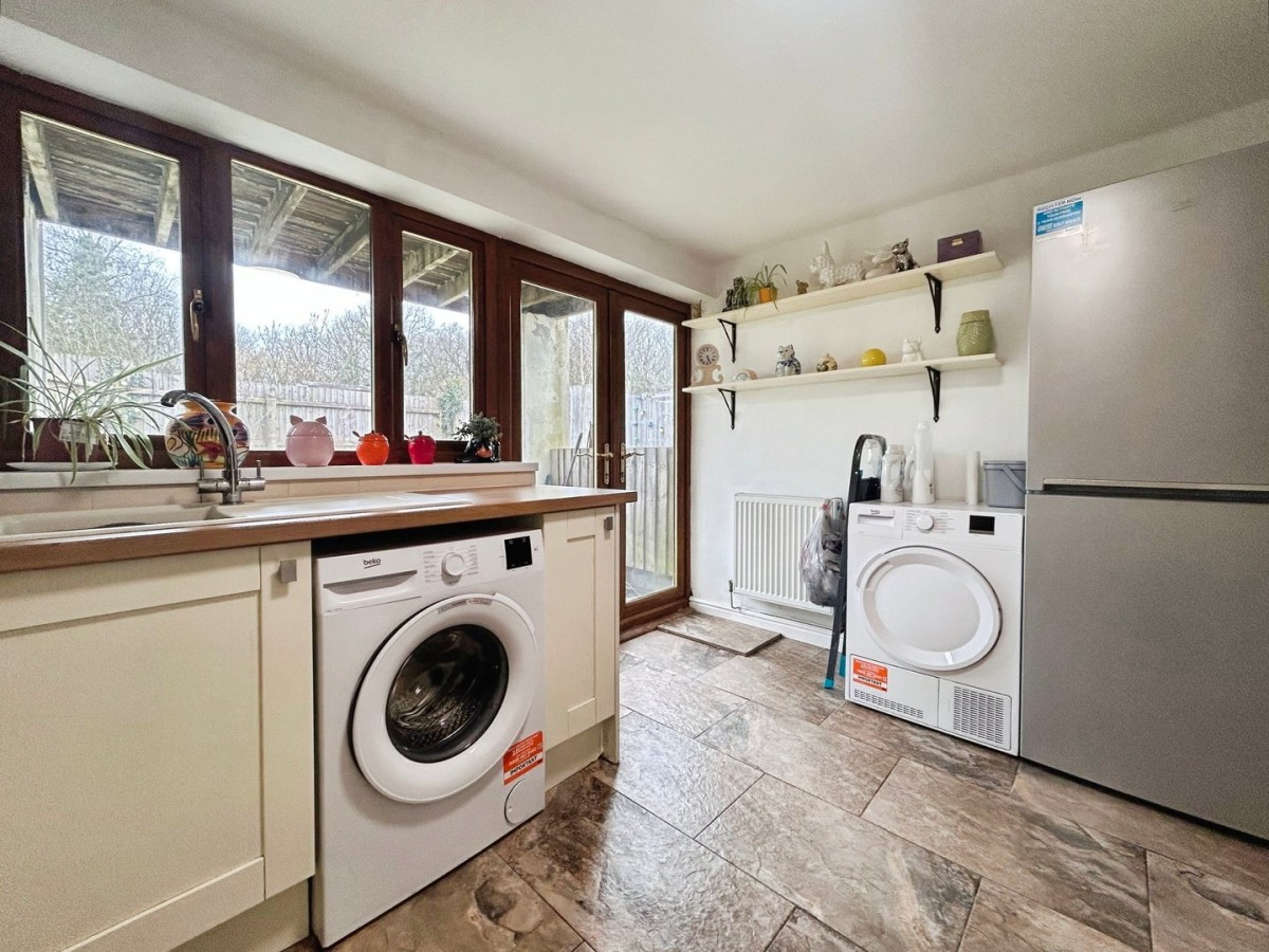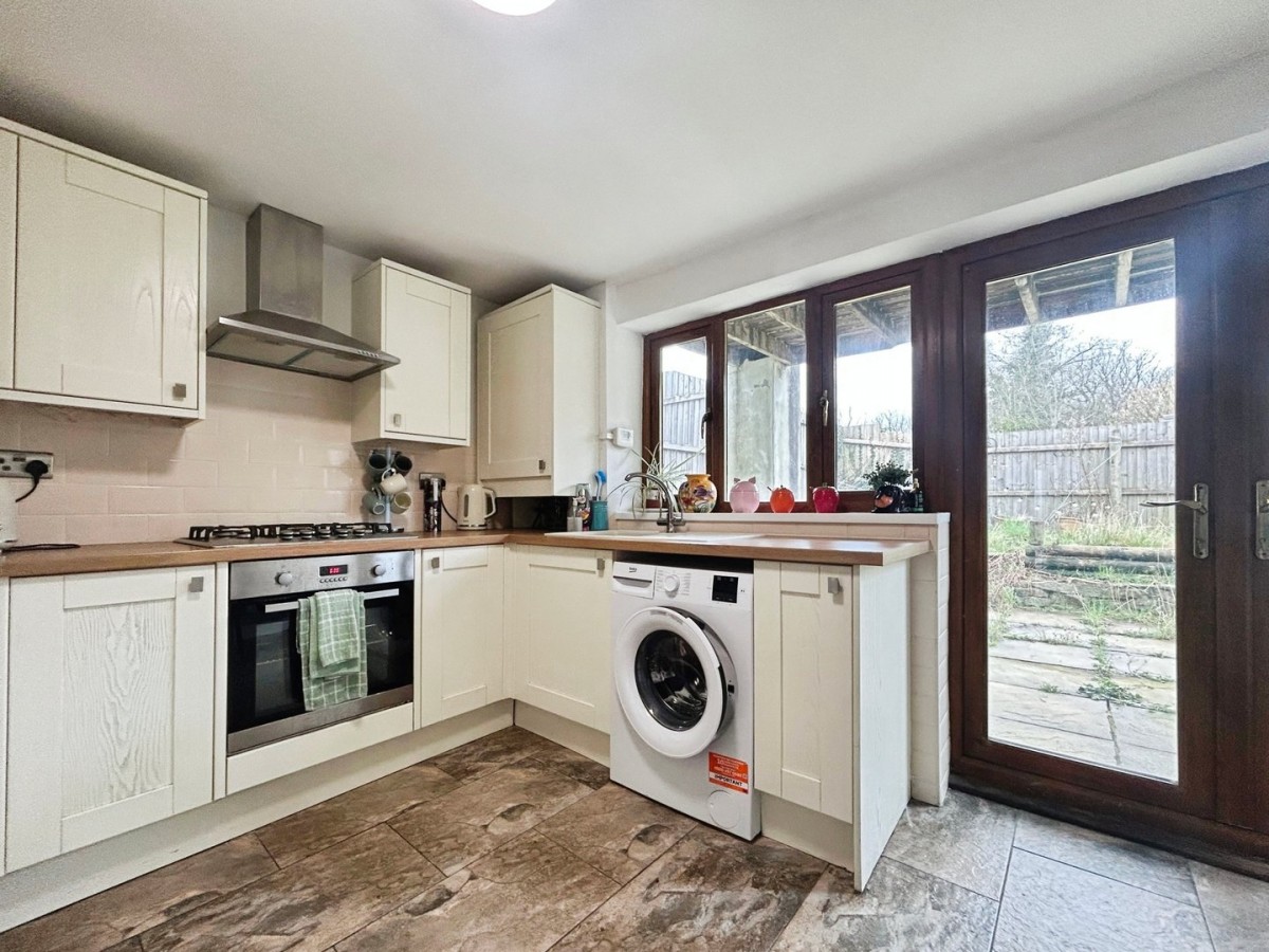 2.89m x 3.55m (9' 6" x 11' 8") Skimmed and emulsioned ceiling, emulsioned walls, skirting, tiled flooring and wood effect double glazed French doors leading to the rear garden and large PVCu window. A range a white shaker style wall and base units with complementary square edge wood effect work tops. Built in single oven with five ring gas burner and overhead stainless steel extractor. Single bowl sink with Swan neck mixer tap. Large storage cupboard and wall mounted cupboard housing combination boiler.