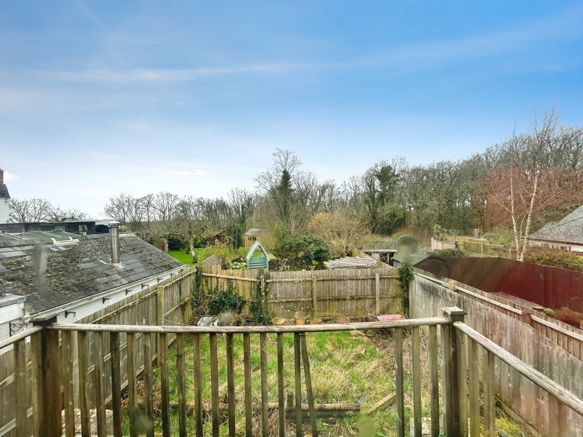The rear garden is bound by feather board edging, small patio with balcony overhead creating an under cover area idea for garden furniture and entertaining. Slight raised grass border and stone area to the side.
