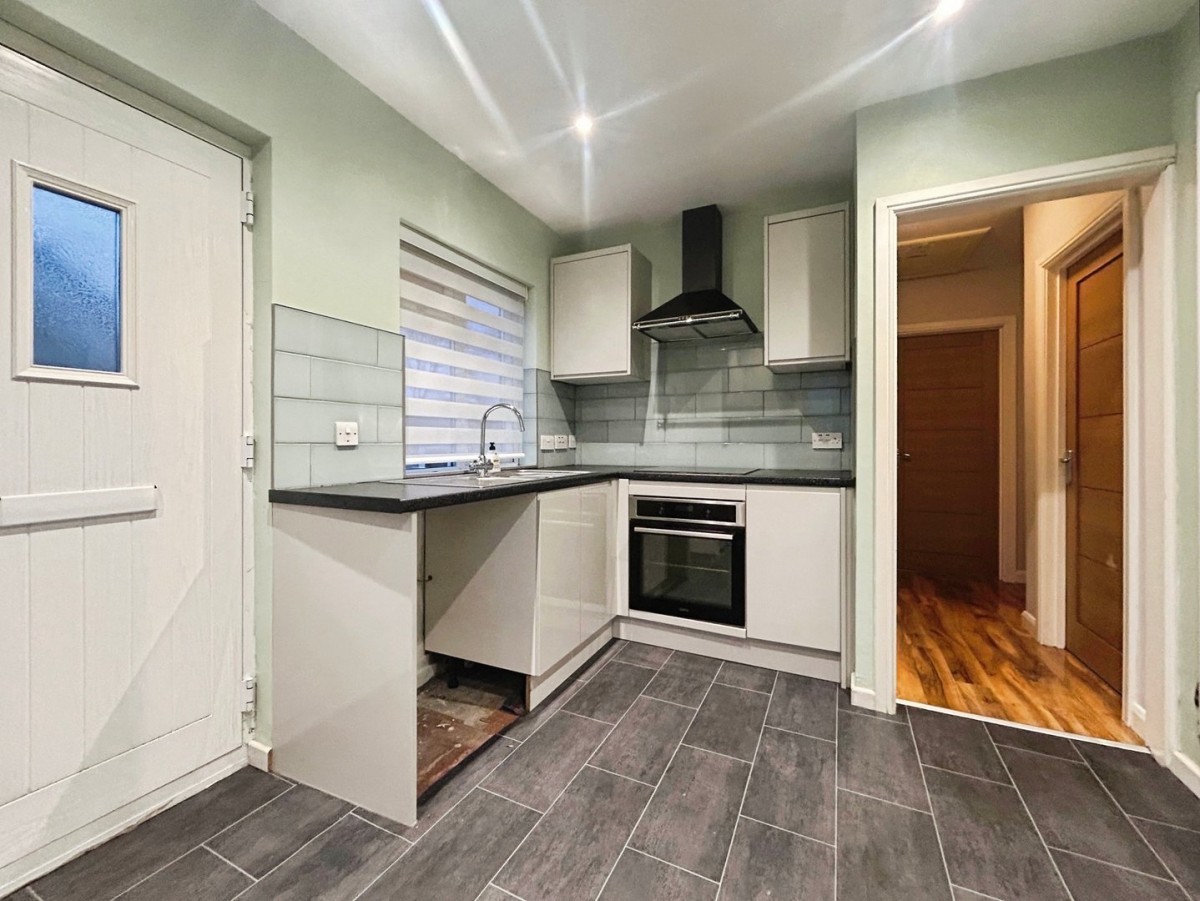2.74m x 3.99m (9' 0" x 13' 1") Skimmed and emulsioned ceiling with inset spot lights and smoke alarm, emulsioned walls, skirting, tile effect vinyl flooring and PVCu windows overlooking the side and front of the property. The kitchen comprises a range of modern grey gloss wall and base units with granite effect square edge work tops and tiled splash back. Built in single oven, electric hob and extractor fan. Stainless steel one and half bowl sink with chrome mixer tap.