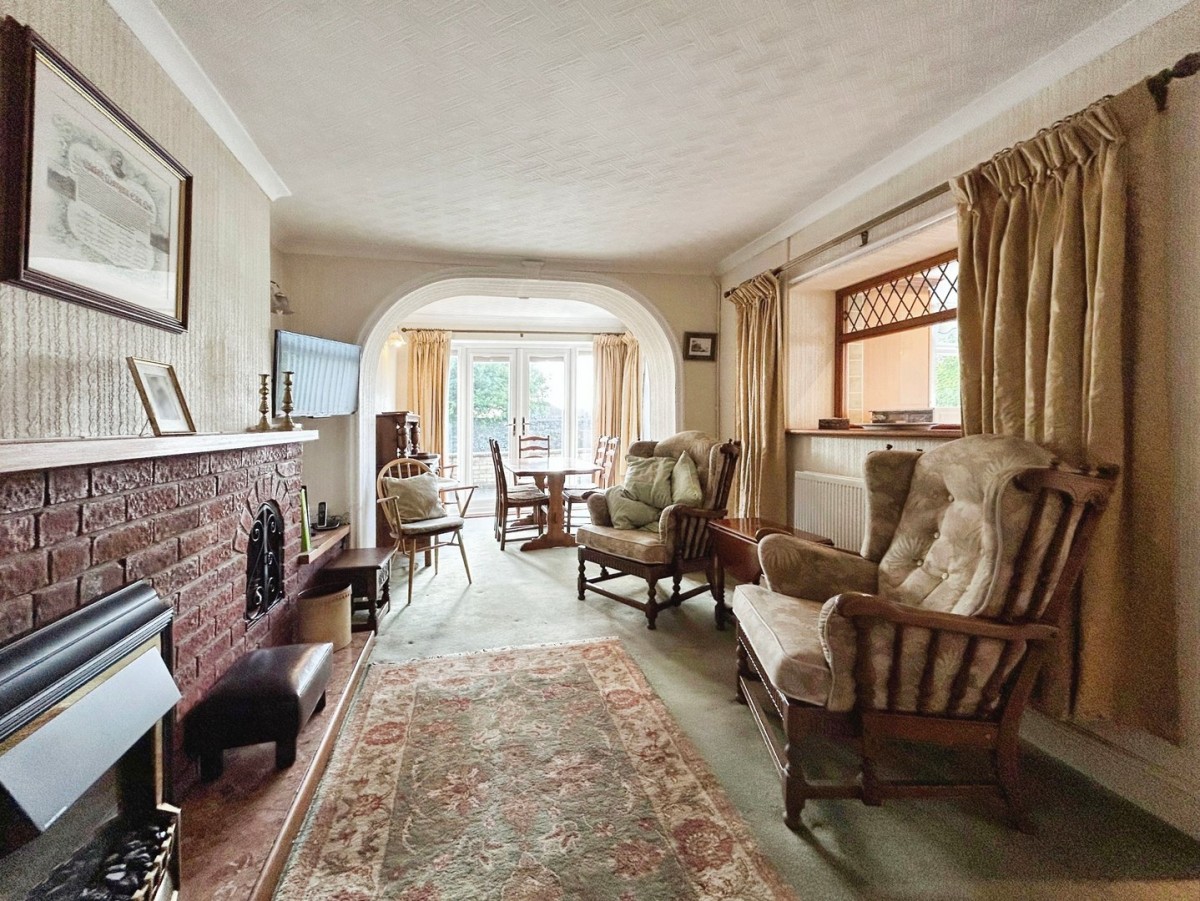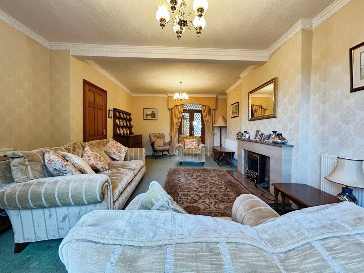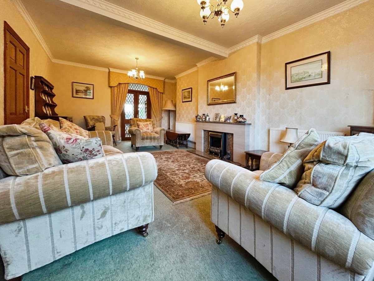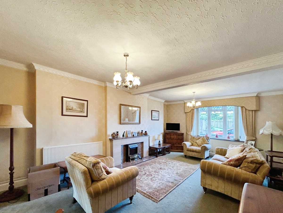 3.74m x 6.5m (12' 3" x 21' 4") Emulsioned, papered and coved ceiling with two sets of pendant lights, papered walls, three radiators, skirting, fitted carpet and PVCu bay window to the front of the property. Fire surround with marble hearth with decorative gas fire to remain. Double doors leading to the kitchen.