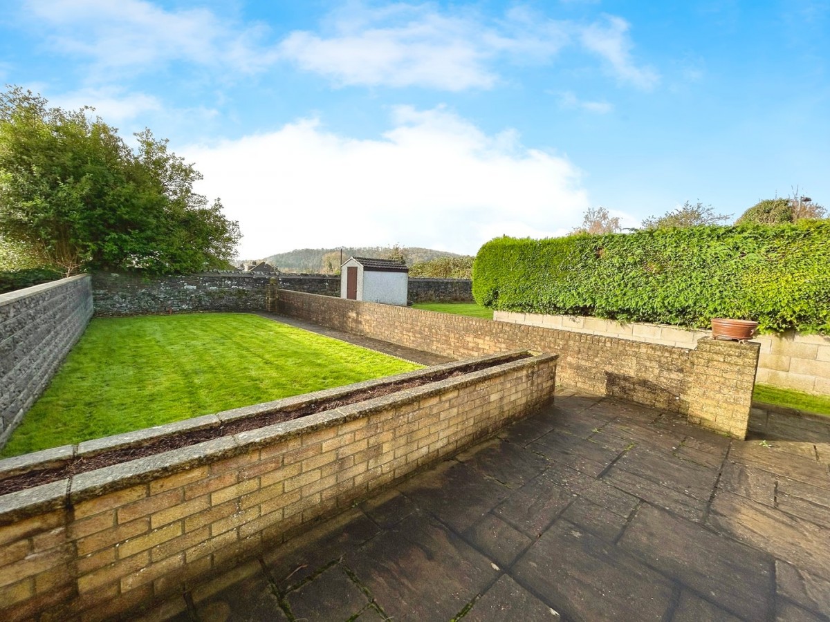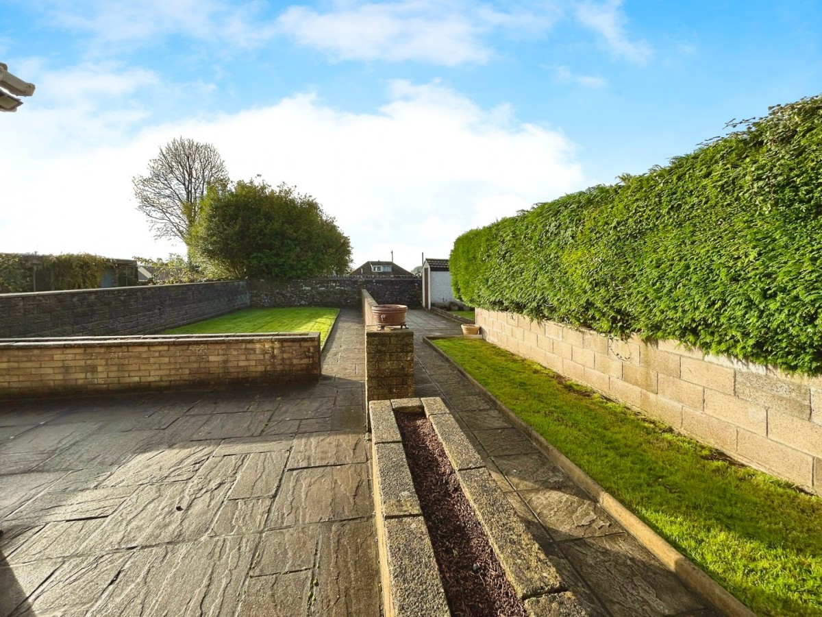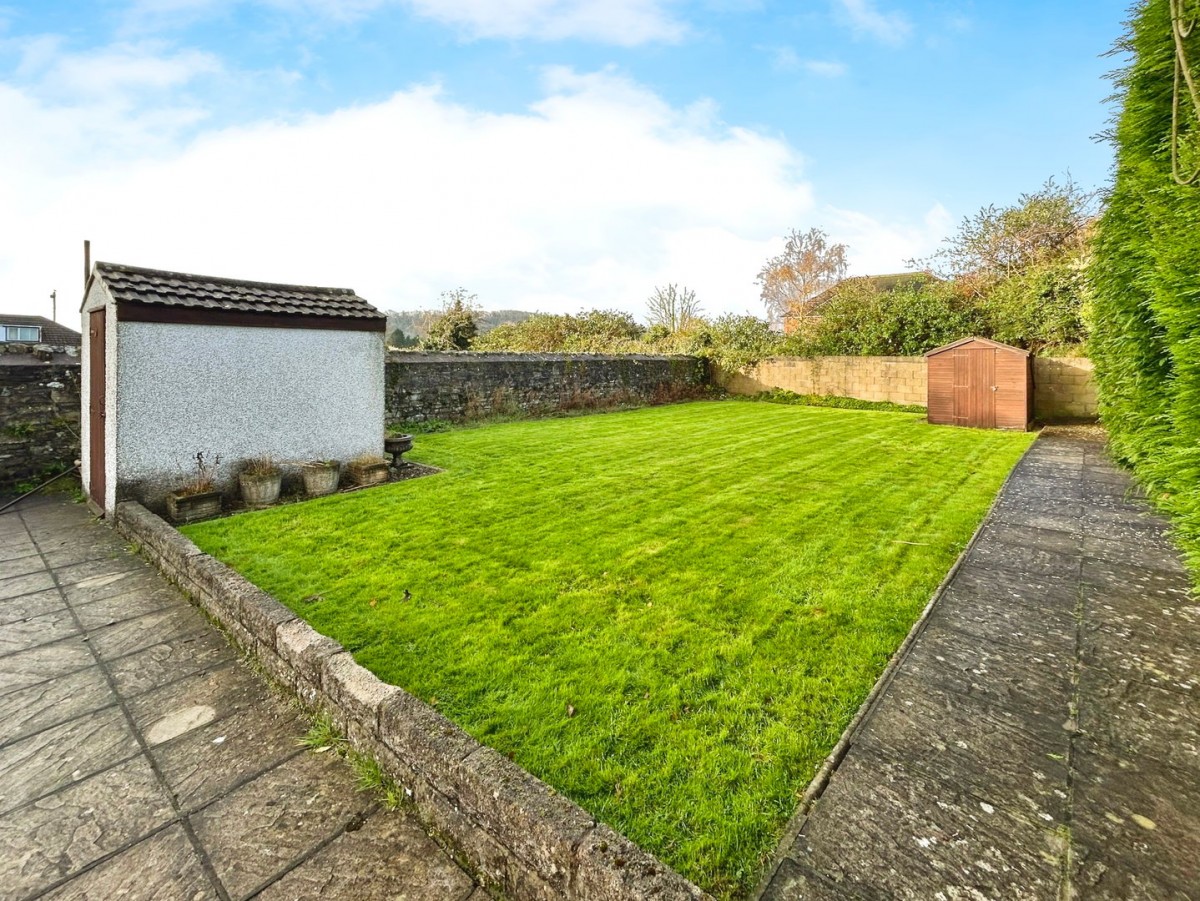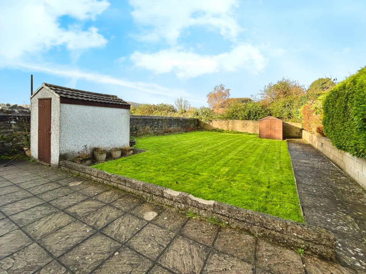 Well maintained large L shaped rear garden laid to lawn with a patio area. Stone wall to the rear, wooden and brick storage sheds to remain.