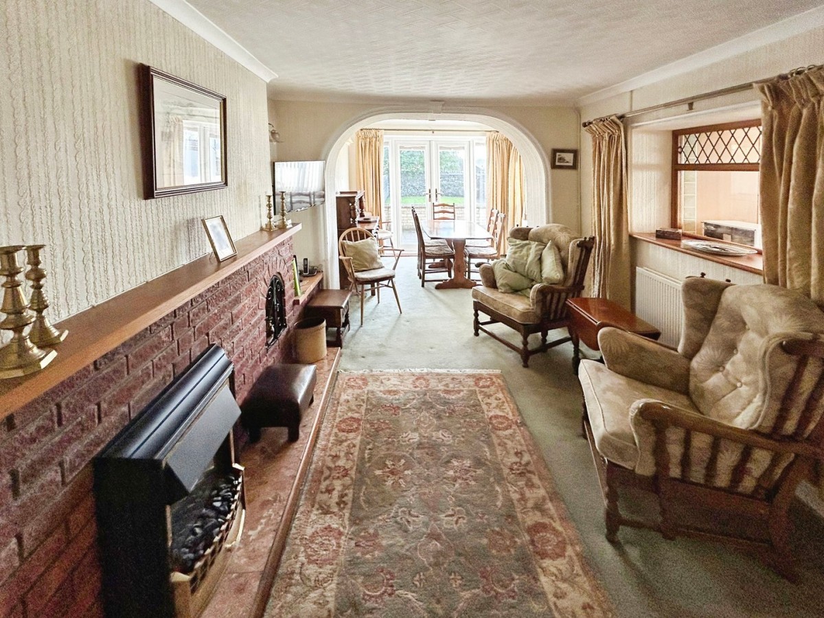 3.35m x 6.43m (11' 0" x 21' 1") Emulsioned, papered and coved ceiling, emulsioned and papered walls, skirting, two radiators and fitted carpet. Feature brick effect fireplace with marble hearth and electric fire to remain. PVCu door leading to the rear garden with two side panels and additional window overlooking the side garden.