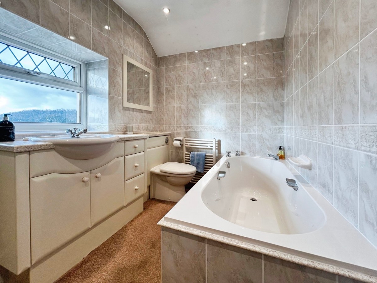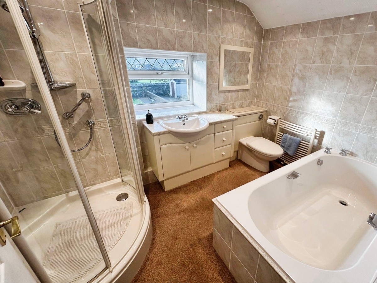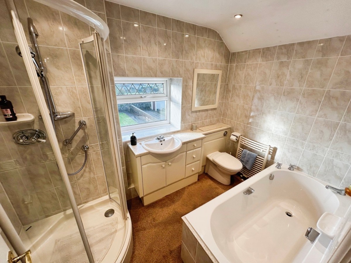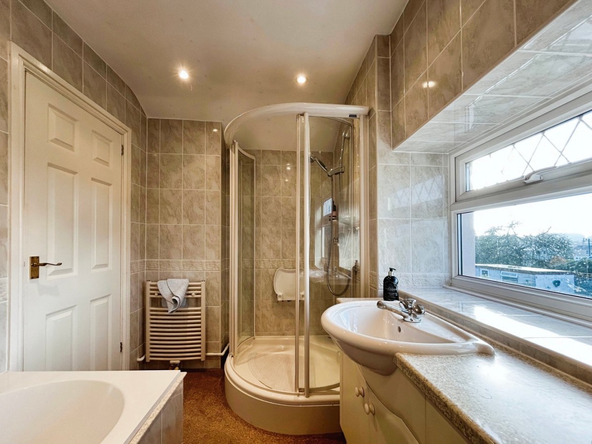 Plastered and emulsioned ceiling with inset spot lights, fully tiled walls, two towel rail radiators, fitted carpet and PVCu double glazed window to the rear of the property. Four piece suite comprising vanity unit with wash hand basin with chrome mixer tap and built in w.c. bath with tiled bath panels and chrome mixer tap and separate freestanding corner shower.