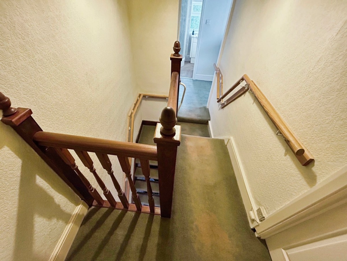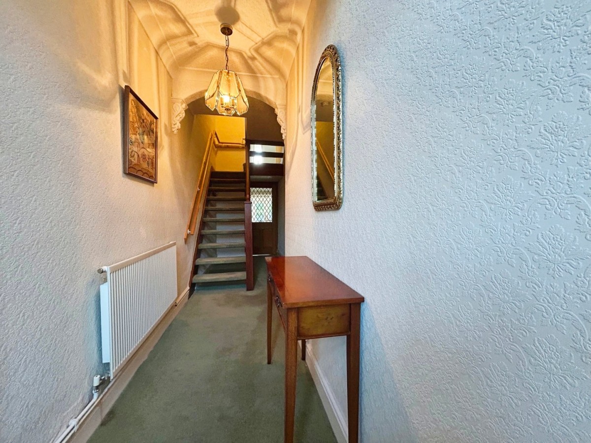 Emulsioned and papered ceiling with pendant light, original decorative feature arch and coving, emulsioned and papered walls, skirting, radiator and fitted carpet. Open staircase with wooden spindles leading to the first floor.