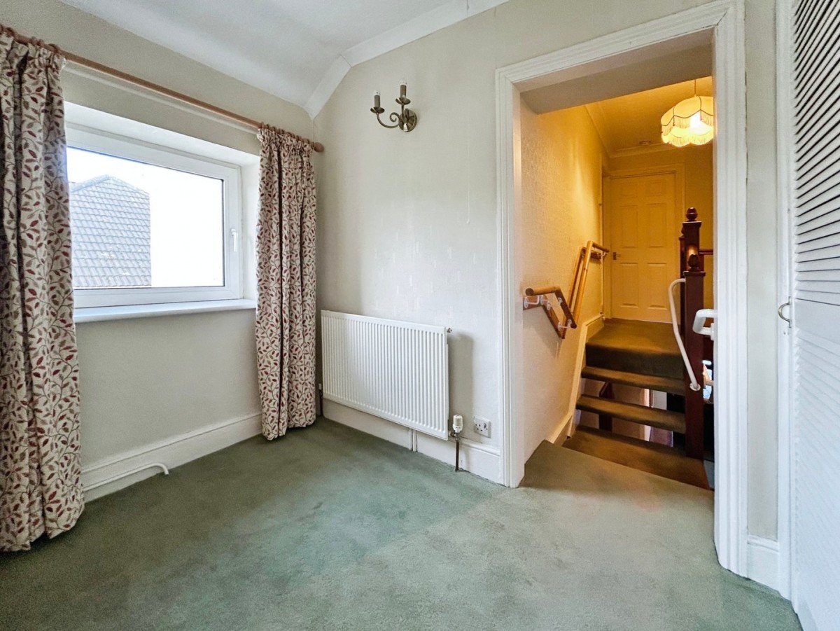 5.7m x 9.3m (18' 8" x 30' 6") Split level landing which has space for an office area or additional storage. Finished with papered, emulsioned and coved ceiling with centre pendant light, loft access, papered and emulsioned walls, skirting, fitted carpet, radiator and PVCu double glazed window. Built in cupboard housing the boiler.
