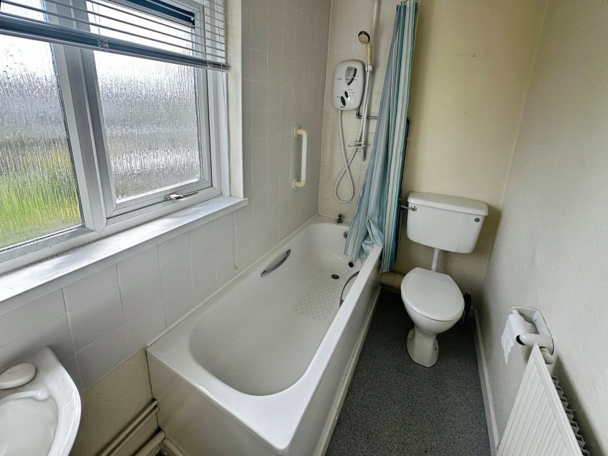 Bathroom overlooking the rear via PVCu double glazed frosted window with a fitted Venetian blind. Three piece suite in white with low-level WC, bath with over bath electric shower and wash hand basin. Radiator. Vinyl floor and ceramic tiles to the splashback.