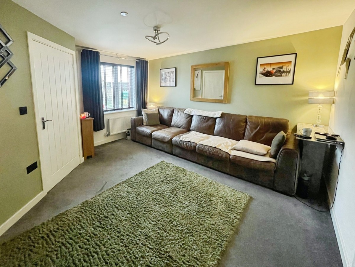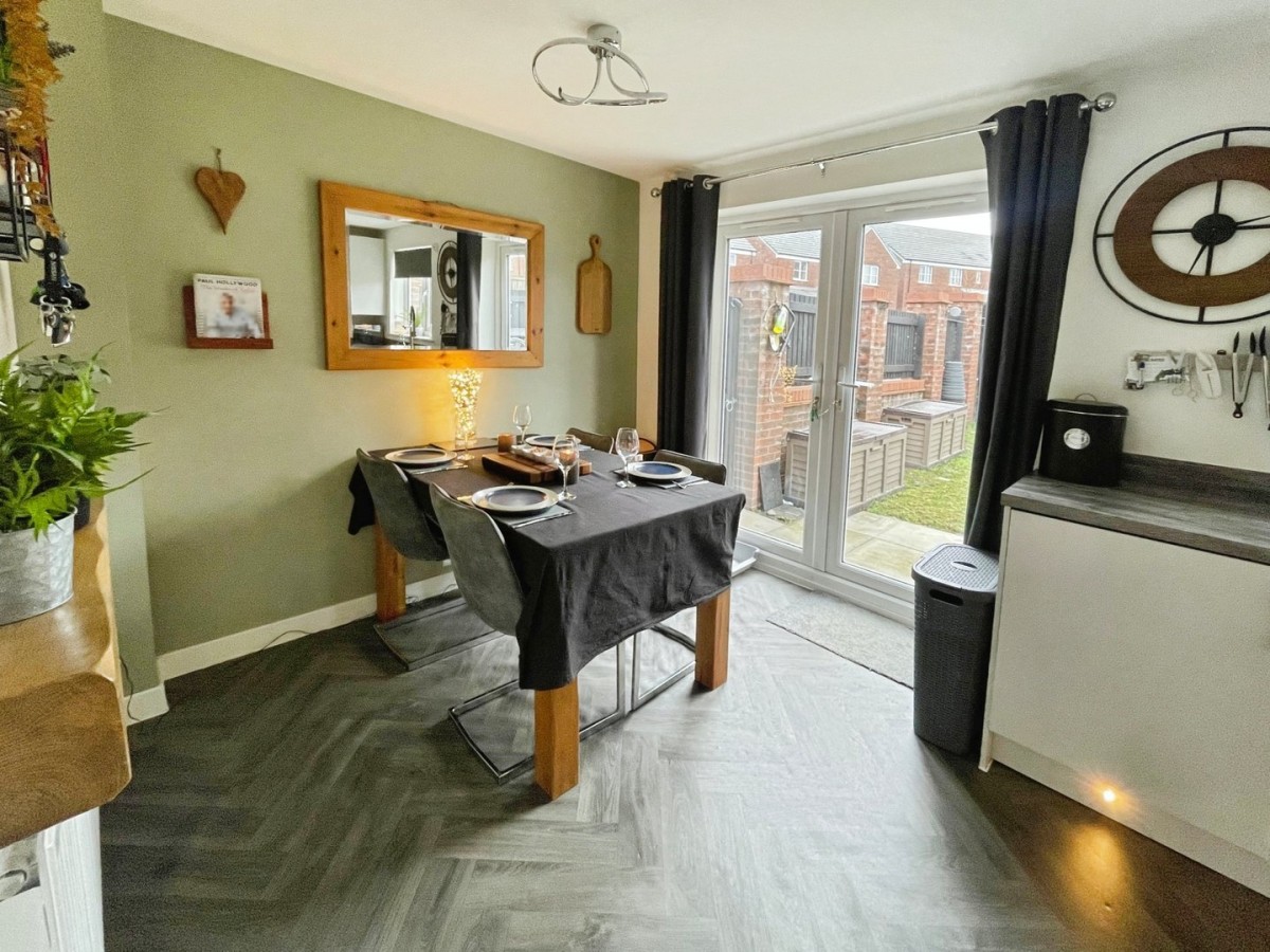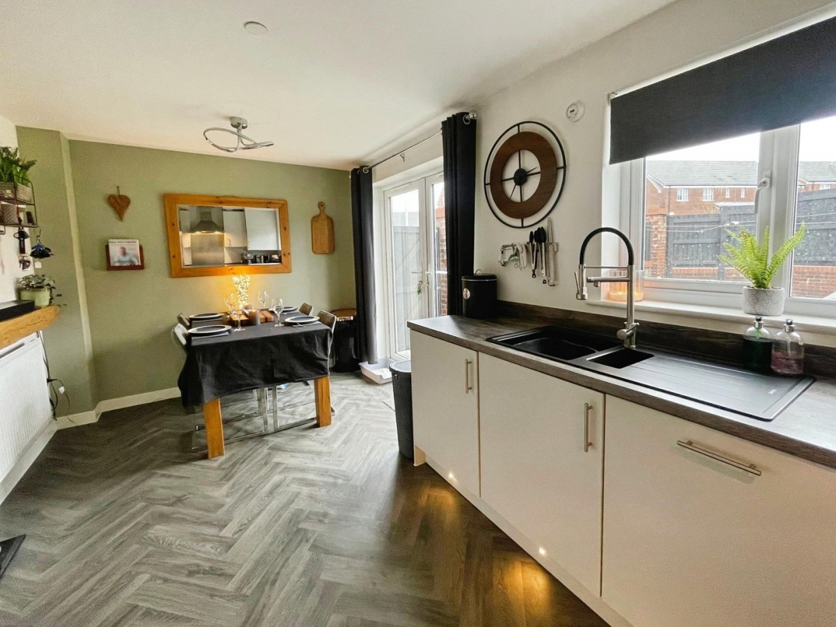 3.70m max x 4.40m (12' 2" max x 14' 5") Emulsioned ceiling and walls with feature panelled wall, light fitting to remain, smoke alarm, PVCu window overlooking the front of the property with Venetian black blinds, radiator and fitted carpet. Doors to under stairs storage and kitchen/diner.