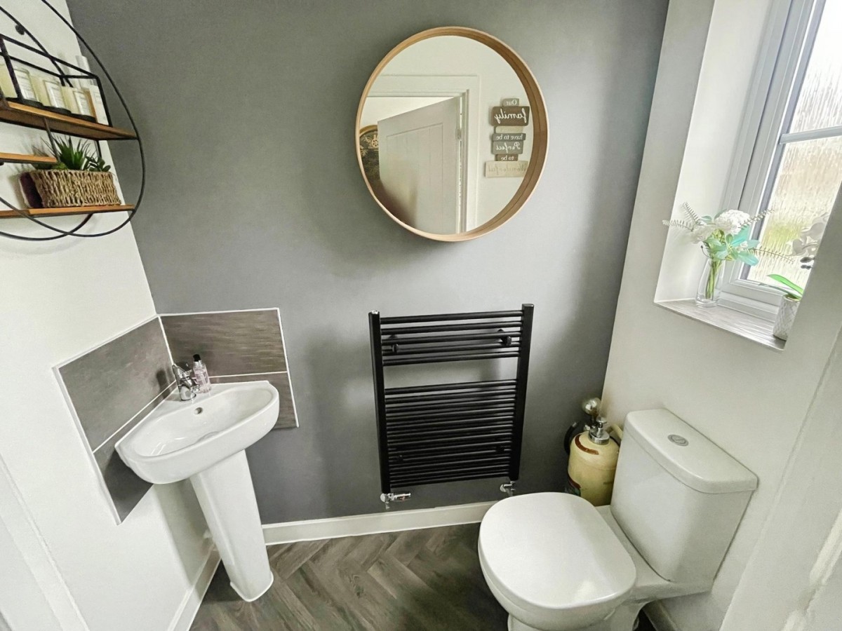 0.90m x 1.70m (2' 11" x 5' 7") Emulsioned ceiling and walls, black towel rail, frosted PVCu window overlooking the front of the property and wood effect herringbone vinyl flooring. Two piece suite comprising low level WC and corner pedestal wash hand basin with tiling to splash back.