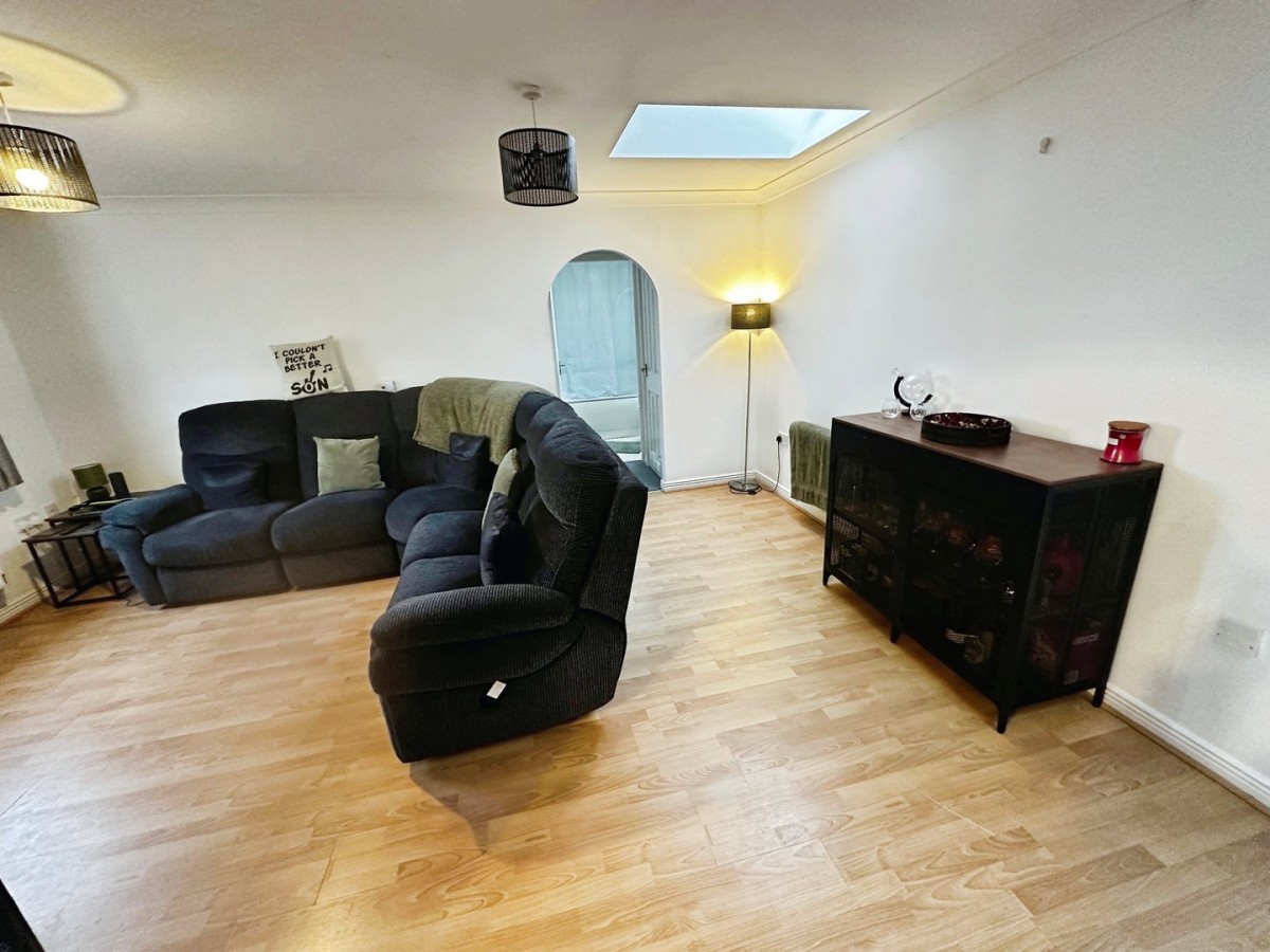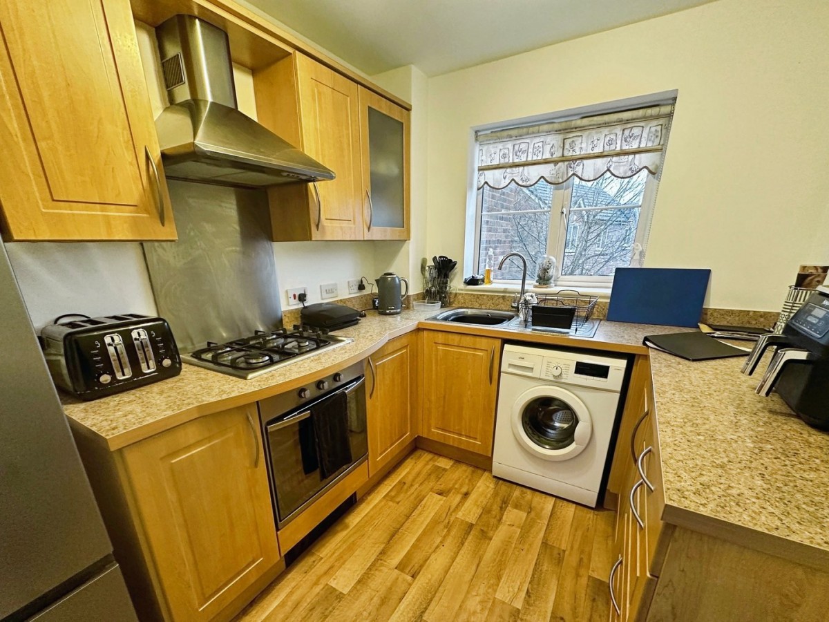 2.4m x 2.9m (7' 10" x 9' 6") PVCu double glazed window to the front with a fitted roller blind. Central spotlight. Wood effect vinyl floor. A range of low level and wall mounted kitchen units in a Beech effect with brushed chrome handles and a complementary rolltop worksurface with matching up stand. Inset sink with swan neck tap and drainer. Integrated electric oven. Four gas ring hob. Overhead extractor hood. Space for fridge freezer and plumbing for washing machine.