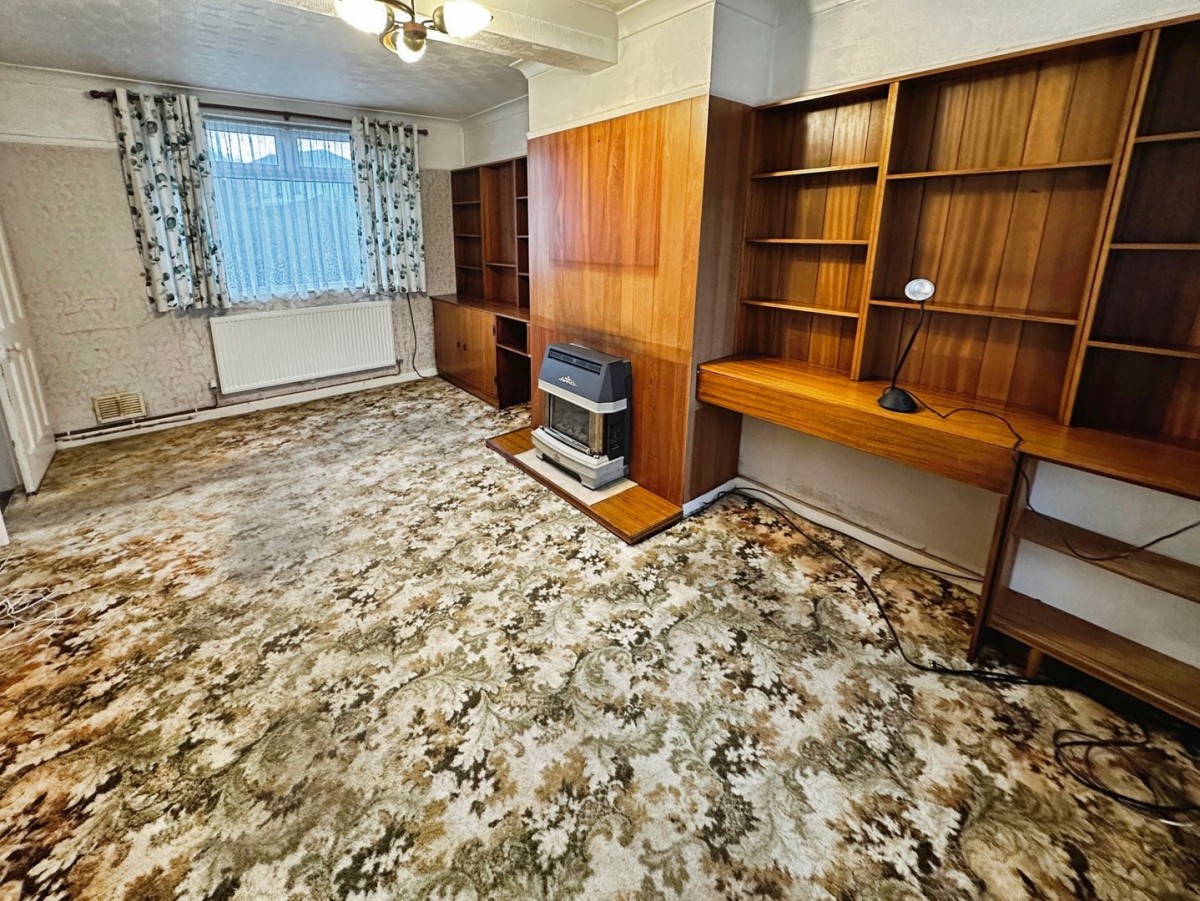 3m x 5.5m (9' 10" x 18' 1") With dual aspect natural light via PVCu double glazed window to the front and to the rear. Voiles and curtains to remain. Finished with papered and coved ceiling, papered walls with a high-level feature picture rail, central light fitting, skirting and fitted carpet. Wall mounted gas coal effect living flame fire with wood panelling and shelving and low-level storage. Sliding door through into the kitchen: