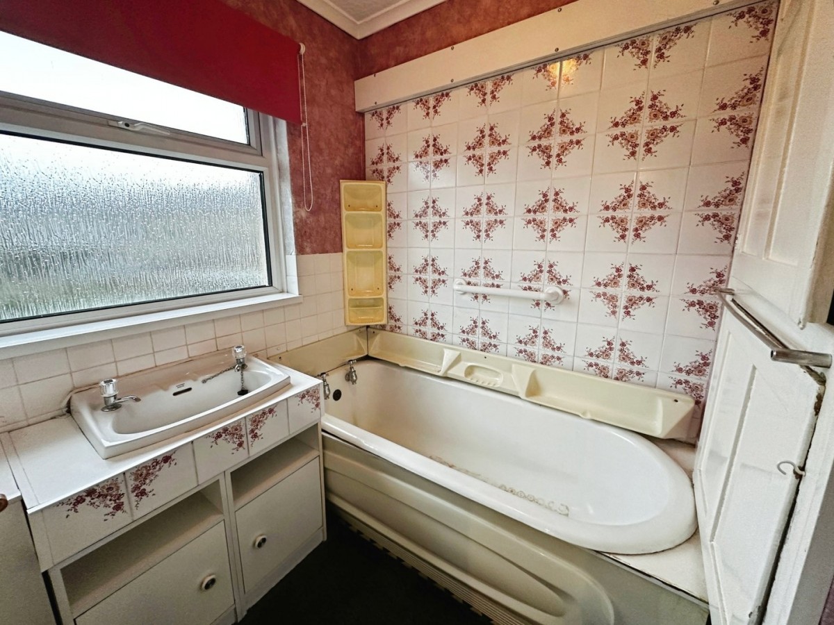 PVCu frosted glazed window to the rear with a fitted roller blind. Finished with central light fitting, tiled and coved ceiling, papered walls, fitted carpet. Inset sink with storage below, bath and a fitted storage cupboard.