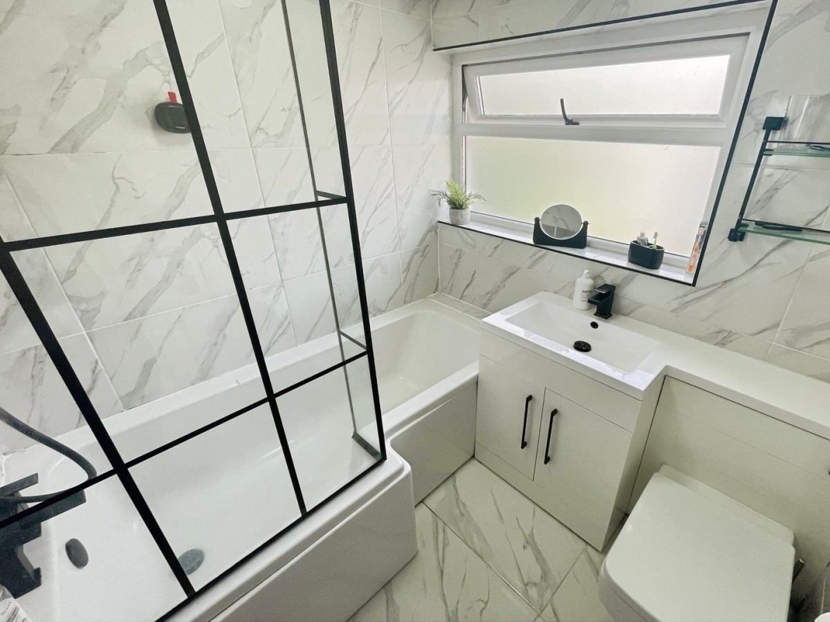 Emulsioned ceiling, centre light, marble effect tiled walls, frosted PVCu double glazed window overlooking the side of the property, wall mounted black towel radiator, wall mounted mirror cabinet and tiled flooring. Three piece suite comprising vanity WC unit, vanity sink unit with black mixer tap, L shaped bath with black mixer tap, overhead black mixer shower and folding glazed screen.