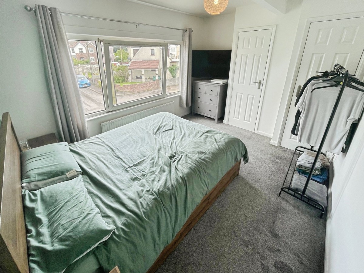 Emulsioned ceiling, pendant light, emulsioned walls, two built in storage cupboard, large PVCu double glazed window overlooking the front of the property, radiator, skirting and fitted carpet.