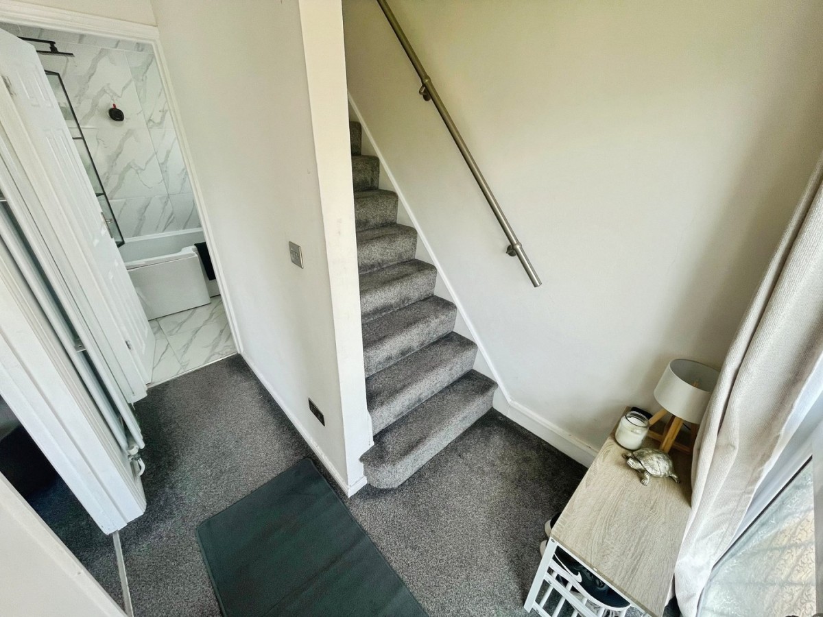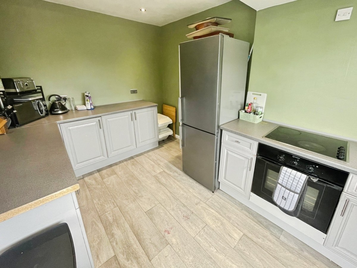Emulsioned ceiling with sunken chrome spot lights, smoke alarm, emulsioned walls, PVCu double glazed window overlooking the rear of the property, PVCu double glazed frosted door leading to the side of the property, radiator, skirting a vinyl flooring. A range of base units in a shaker style grey with complementary roll top work surface. Space for freestanding fridge/freezer, freestanding washing machine and tumble dryer. Integrated electric oven with four ring electric hob. Inset stainless steel sink with chrome mixer tap. Wall mounted gas combination boiler.