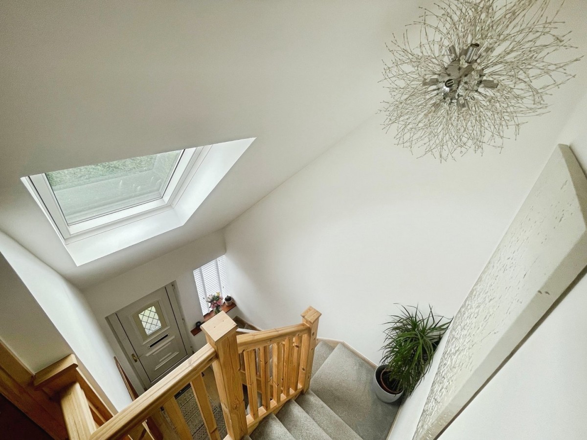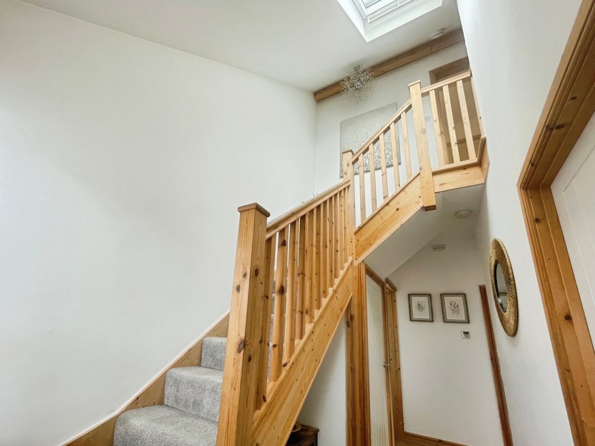 PVCu window to the front of the property with venetian blind, velux window, laminate flooring, and wooden newly fitted balustrade with carpeted stairs leading to the first floor. Doors leading to the lounge, kitchen/diner, downstairs bathroom and two bedrooms.