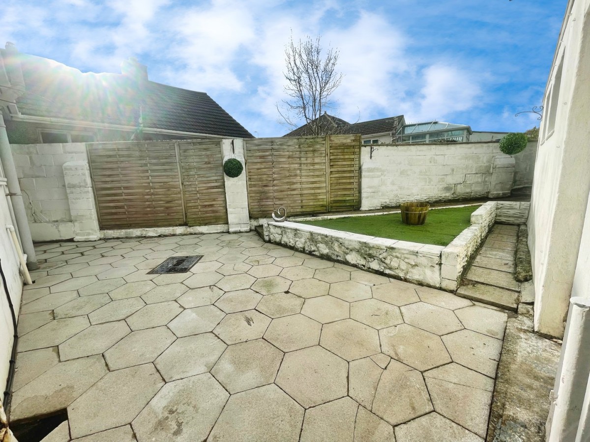 The rear garden is bound by wall and fence panels, paved with steps leading to a raised Astroturf area with dwarf wall. Side access to the garage.