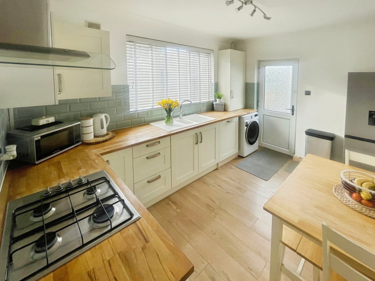 2.80m x 3.80m (9' 2" x 12' 6") A range of wall and base units with complementary work surfaces housing a stainless steel sink drainer with mixer tap. Stainless steel four ring gas burner, inset oven with stainless steel and glass extractor above. Integrated dishwasher and boiler housed within a kitchen cupboard. PVCu window with venetian blinds to the rear of the property and tiled splash back. A continuation of the laminate flooring, radiator and PVCu frosted door to the side leading to the rear garden.