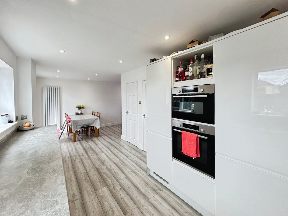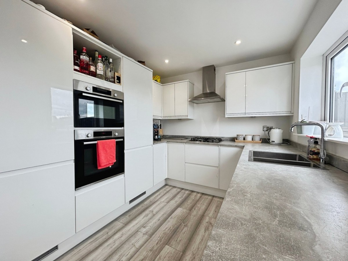Emulsioned ceiling with inset lights,emulsioned walls, PVCu window overlooking the front of the property, two PVCu windows overlooking the rear garden, French doors leading out to the rear garden, two radiators, skirting and a continuation of the grey laminate flooring. A range of high gloss wall and base units with quartz effect square edge complementary work surface. Gas ring hob with stainless steel overhead extractor. Built in double oven. Integrated dishwasher and washing machine. One and a half bowl sink with swan neck mixer tap. Under stair storage cupboard.