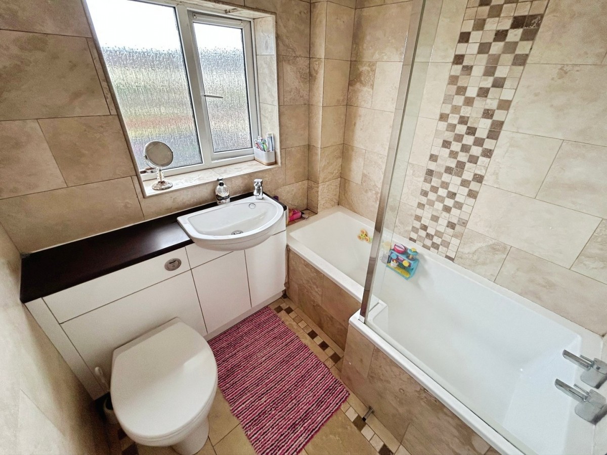 Emulsioned ceiling with inset spot lights, PVCu frosted glazed window overlooking the rear of the property, fully tiled walls and tiled flooring. Three piece suite comprising vanity unit housing sink with mixer tap and WC, P shaped bath with chrome taps and wall mounted shower.