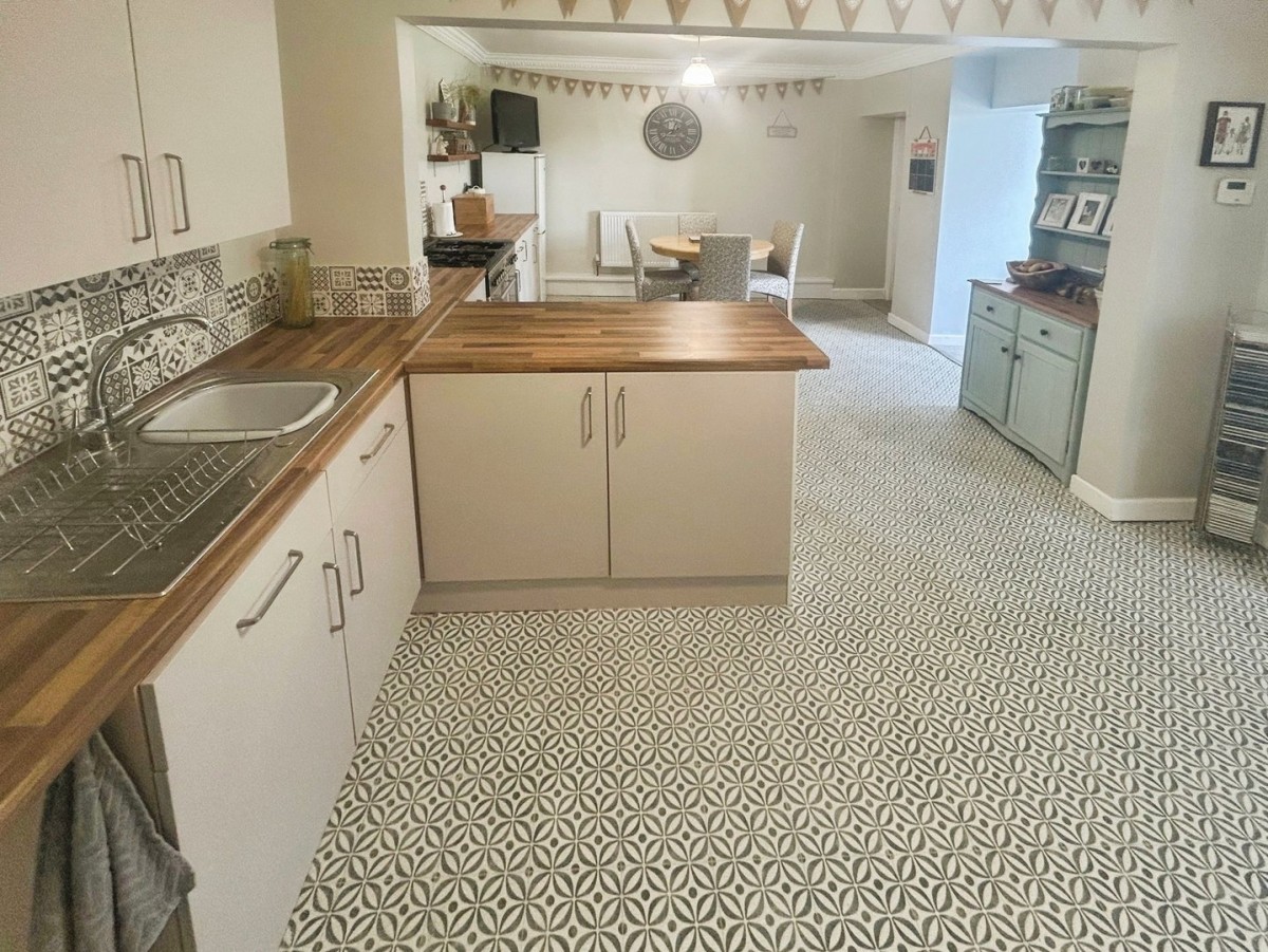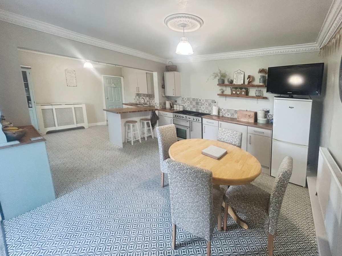 Emulsioned ceiling, two pendant lights, ceiling rose, decorative coving, emulsioned walls with tiling to splash back areas, two radiators, skirting and tile effect vinyl flooring. A range of wall and base units with complementary square edge wood effect laminate work surface. Gas Range cooker to remain. Space for freestanding fridge/freezer. Space for dining room table. Breakfast bar with space for 2 stools. Inset stainless steel sink with chrome mixer tap. Opening into snug/office space. Door leading to utility. Door to pantry style cupboard.