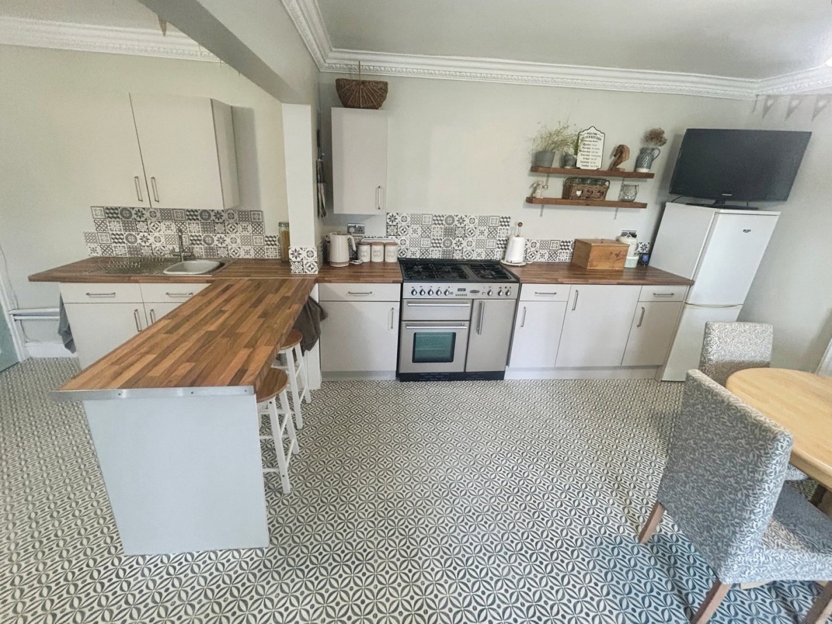 Emulsioned ceiling, centre light, emulsioned walls with tiling to splash back areas, PVCu double glazed window overlooking the front of the property, skirting and tiled flooring. A range of base units in a shaker style cream with complementary roll top work surface. Inset stainless steel sink with chrome taps. Wall mounted gas combination boiler. Space for washing machine and further under counter fridge.