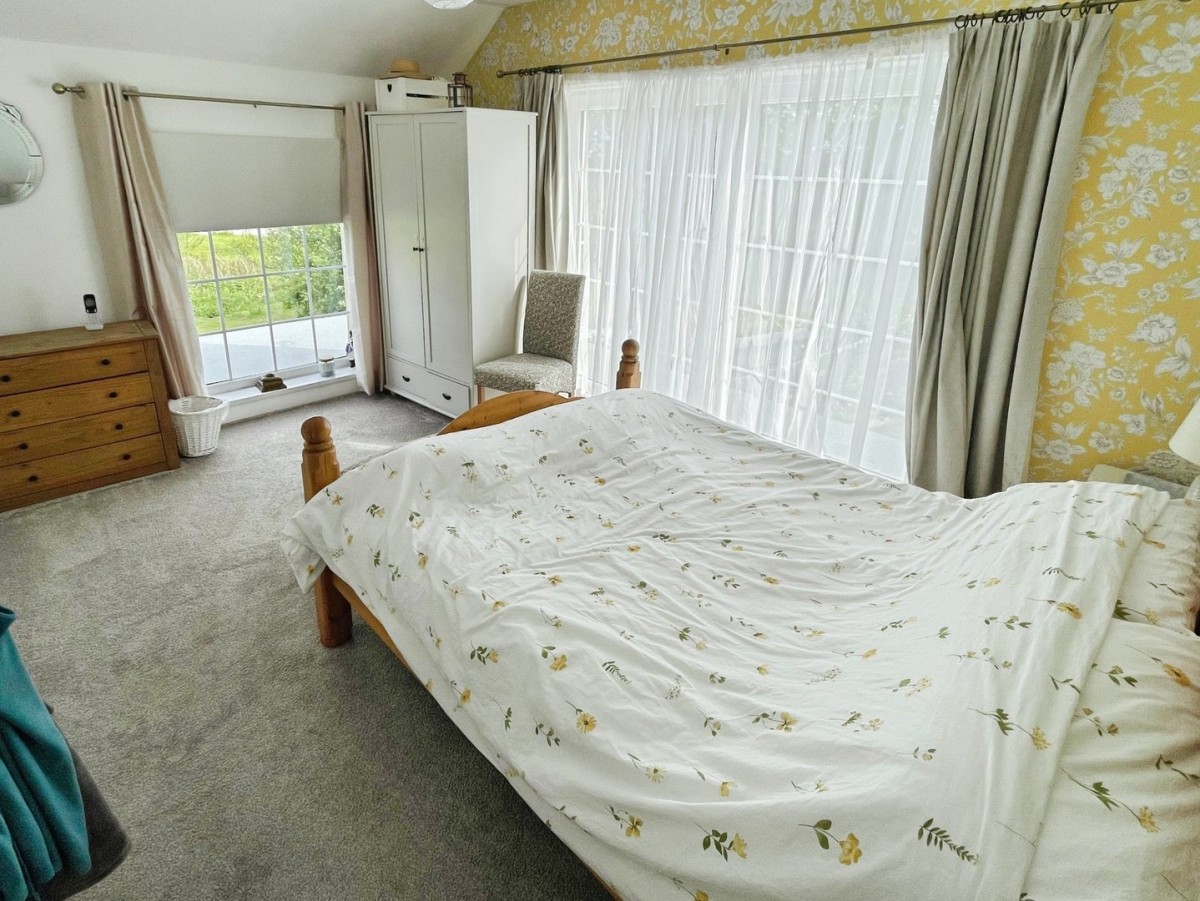 Textured ceiling, centre light, emulsioned walls with one feature papered wall, PVCu double glazed window overlooking the front, radiator, PVCu double glazed sliding door leading out to the extension roof, skirting and fitted carpet.