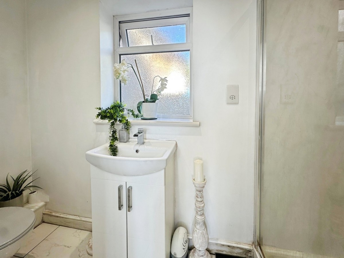 PVCu frosted glazed window to the front, emulsioned ceiling, ceiling mounted extractor, recessed LED spot lights, emulsioned walls, wall mounted shaver point, radiator, skirting and ceramic tiled flooring. Three piece suite in white comprising WC, wash hand basin with chrome waterfall tap and vanity unit and a large walk in shower cubicle with respatex to the splash backs and a large glazed door.