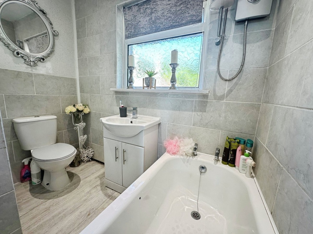 Skimmed ceiling with recessed LED spot lights, ceramic tiled walls, heated wall mounted towel rail and laminate flooring. Three piece suite in white comprising WC, wash hand basin with chrome mixer tap set on vanity unit and bath.