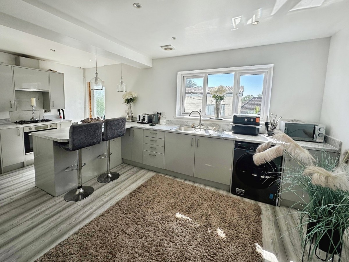 Narrowing to 4.50m and narrowing to 2.70m. The kitchen is arranged with skimmed ceiling, recessed LED spot lights, emulsioned walls and a continuation of the laminate floor. Frosted glazed PVCu door leading out to the rear and a PVCu double glazed window overlooking the rear. The kitchen comprises a range of low level and wall mounted units in high gloss dove grey with brushed chrome handles and a complementary roll top work surface with matching up stand. Inset sink with swan neck tap and drainer. Integrated electric oven with four ring gas hob and overhead extractor hood. Breakfast bar. Ample space for dining table and/or living room furniture. Under stairs storage cupboard with power (space for fridge/freezer). Plumbing and space for automatic washing machine. Door through to shower room.