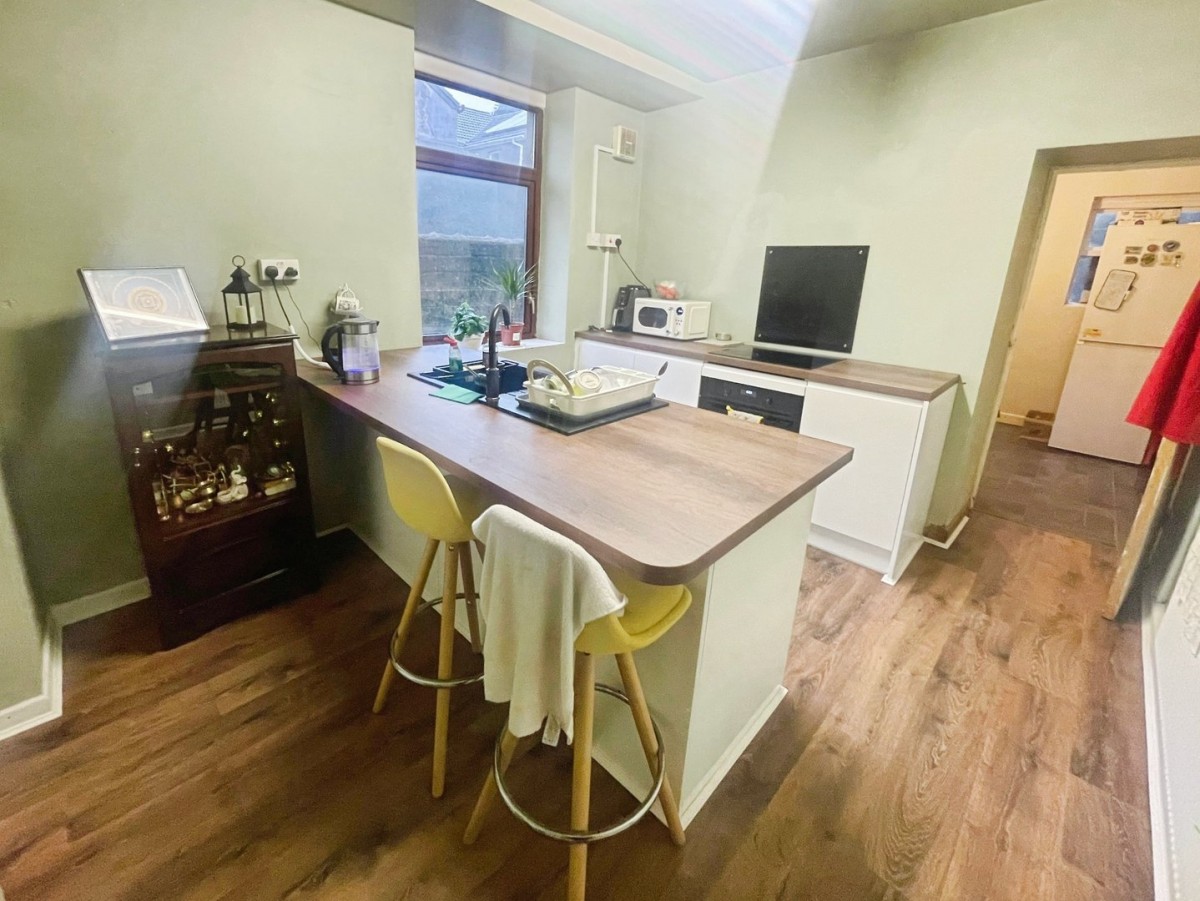 Emulsioned ceiling and walls, laminate flooring in wood effect, radiator and window overlooking the side. A range of gloss base units with complementary wooden laminate work surfaces housing a black sink with mixer tap and breakfast bar. Four ring induction hob with glass splash back and built in oven. Door leading into the utility.