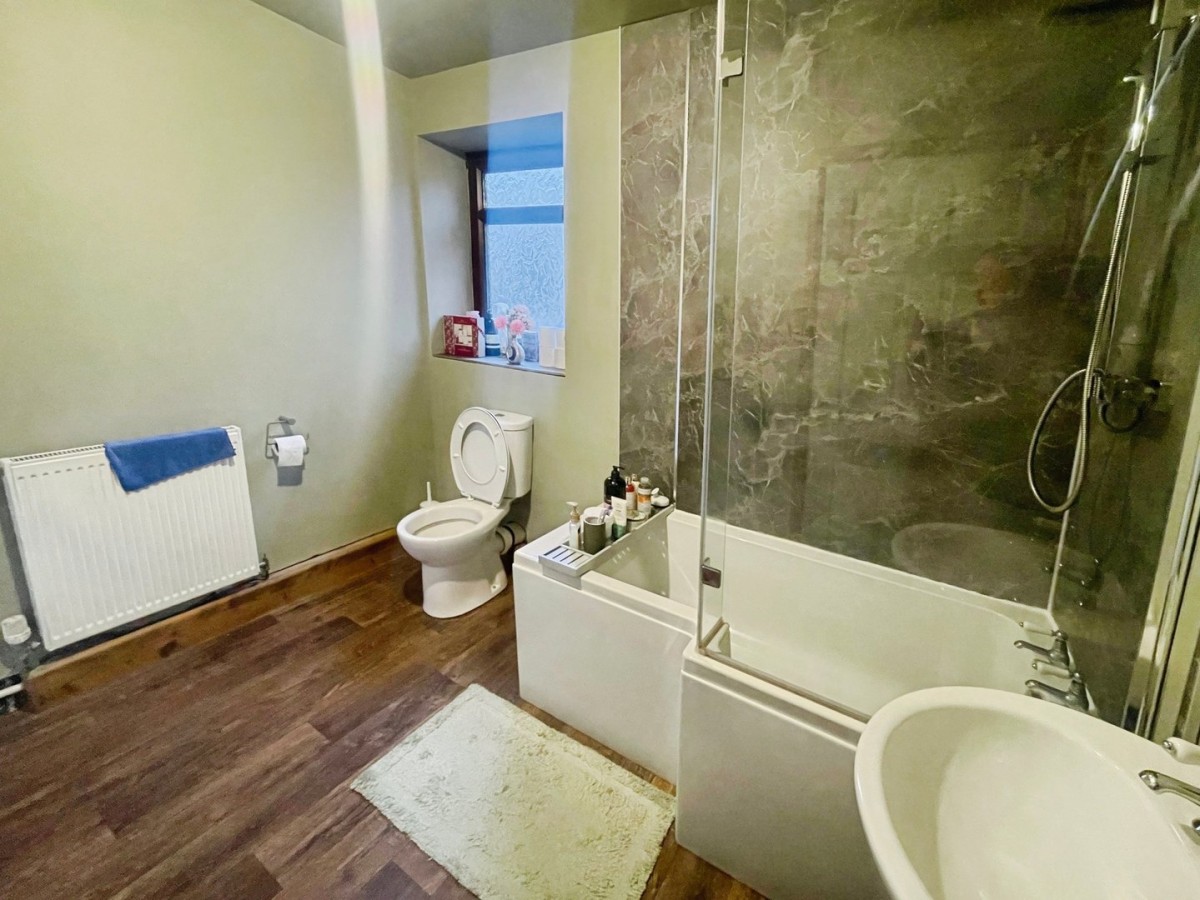 Emulsioned ceiling and walls, radiator, wood effect vinyl flooring and frosted PVCu window. Three piece suite comprising p shaped bath with overhead rainforest shower with hand attachment, aqua panels to the splash backs and shower screen, pedestal wash hand basin and WC. Fitted storage cupboard housing the boiler.