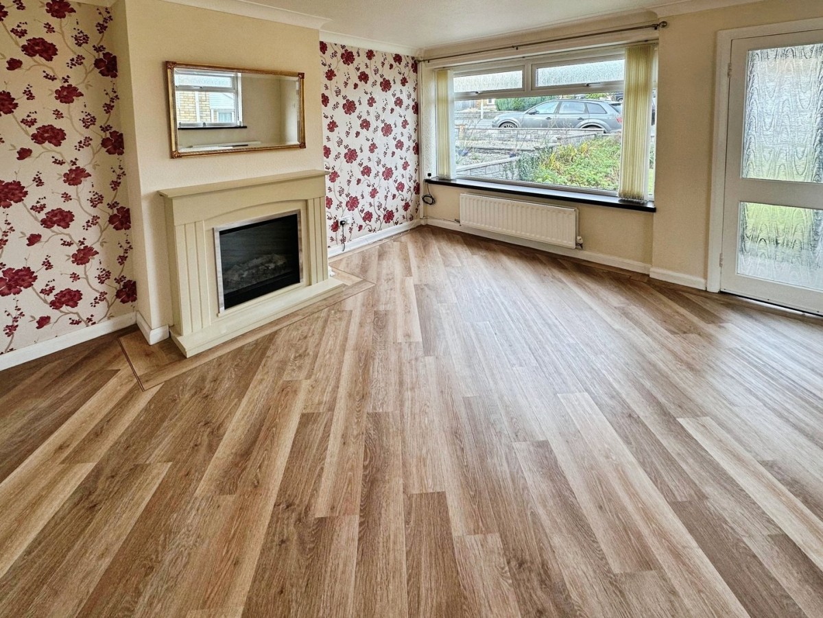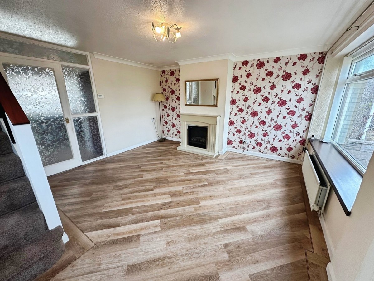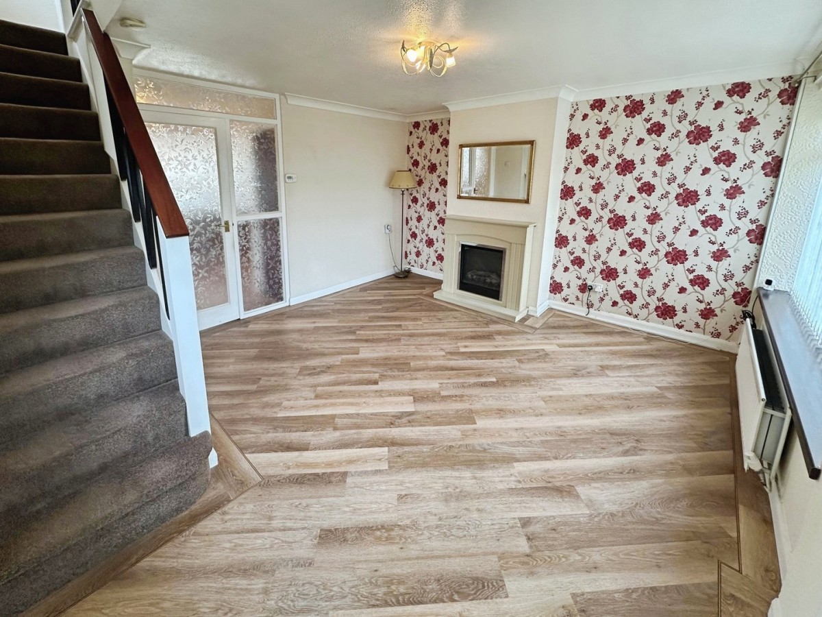 Benefiting from dual aspect natural light via PVCu double glazed window to the side and to the front with fitted vertical blind and finished with a coved ceiling, central light fitting, papered and emulsioned walls with one feature papered wall, skirting and LVT wood effect flooring. Wall mounted feature fireplace. Stairs to the first floor. Glazed door leading through into the open plan kitchen/diner.