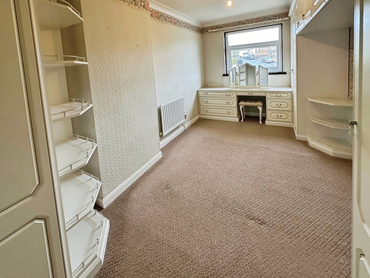 Overlooking the front via PVCu double glazed window and finished with a coved ceiling, papered and emulsioned walls with a high level feature border, skirting and fitted carpet. Fitted storage comprising two double fitted wardrobes plus one single, bedside cabinets over bed cupboard space, dressing table and shelving.