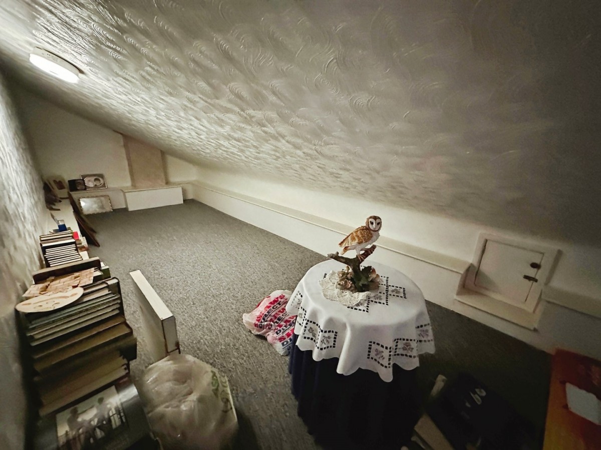 Via stairs with fitted carpet and wooden balustrade. Large area of eaves storage. Fitted storage with a wall mounted gas fired Baxi combination boiler.