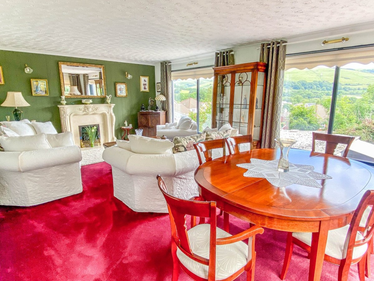 Large open plan reception room at the rear of the property offering outstanding views towards the Darren mountain and Llynfi Valley. Artexed ceiling, tongue and groove wood cladding to the walls, five wall lights, two radiators and fitted carpet. This bright and airy room is filled with plenty of natural light via large picture windows and two sets of PVCu double glazed anthracite windows to the side of the property. The focal point of the room is the gas fireplace with stone mantel, marble hearth and surround. Sliding doors leading into reception room two.