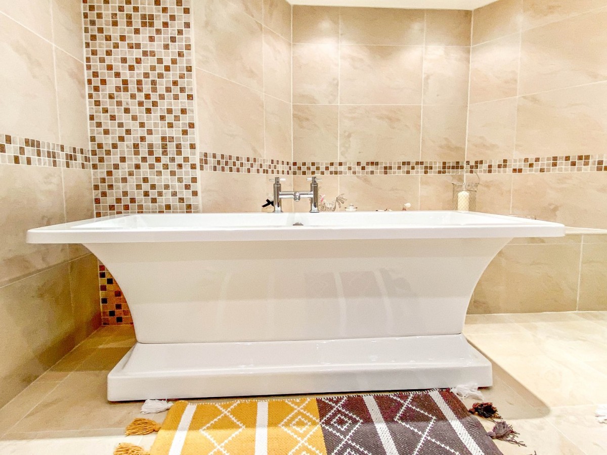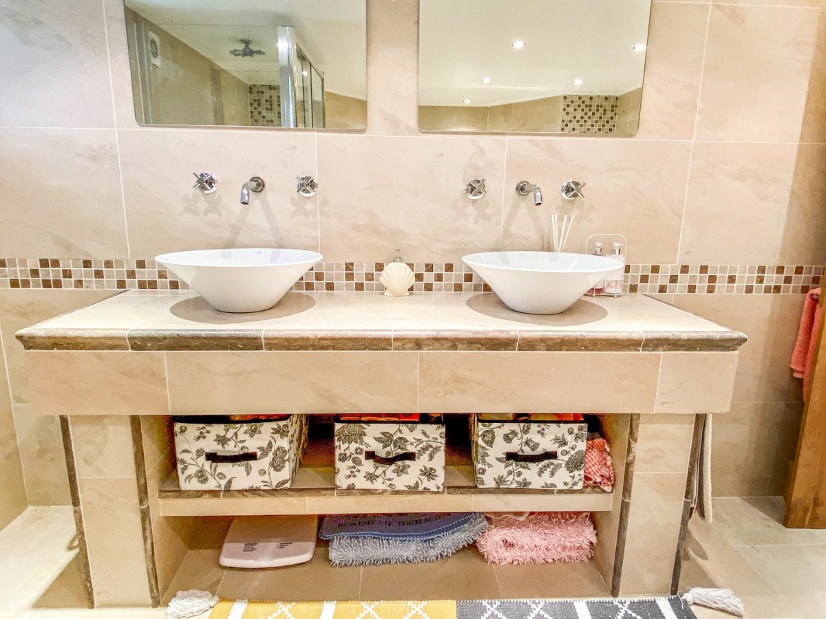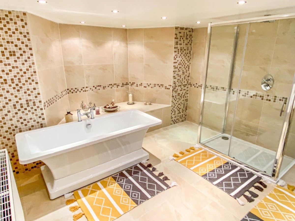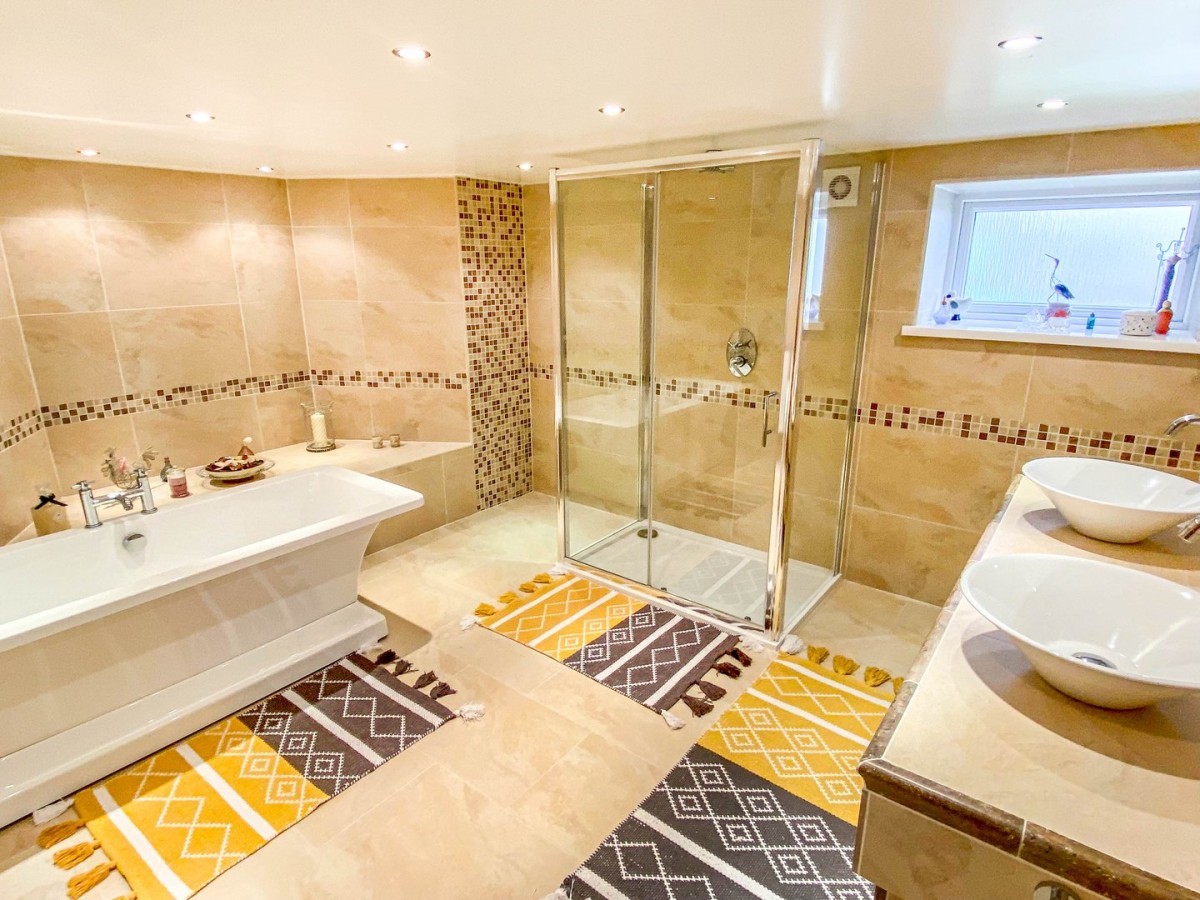 Skimmed ceiling with inset spot lights, floor to ceiling tiled walls with decorative tile borders, radiator, PVCu frosted double glazed window overlooking the rear and tiled flooring. Three piece suite comprising walk in double shower with sliding door and rainfall shower head, freestanding bath with chrome fixtures, double basin set on a beautiful vanity with storage beneath and chrome fittings.