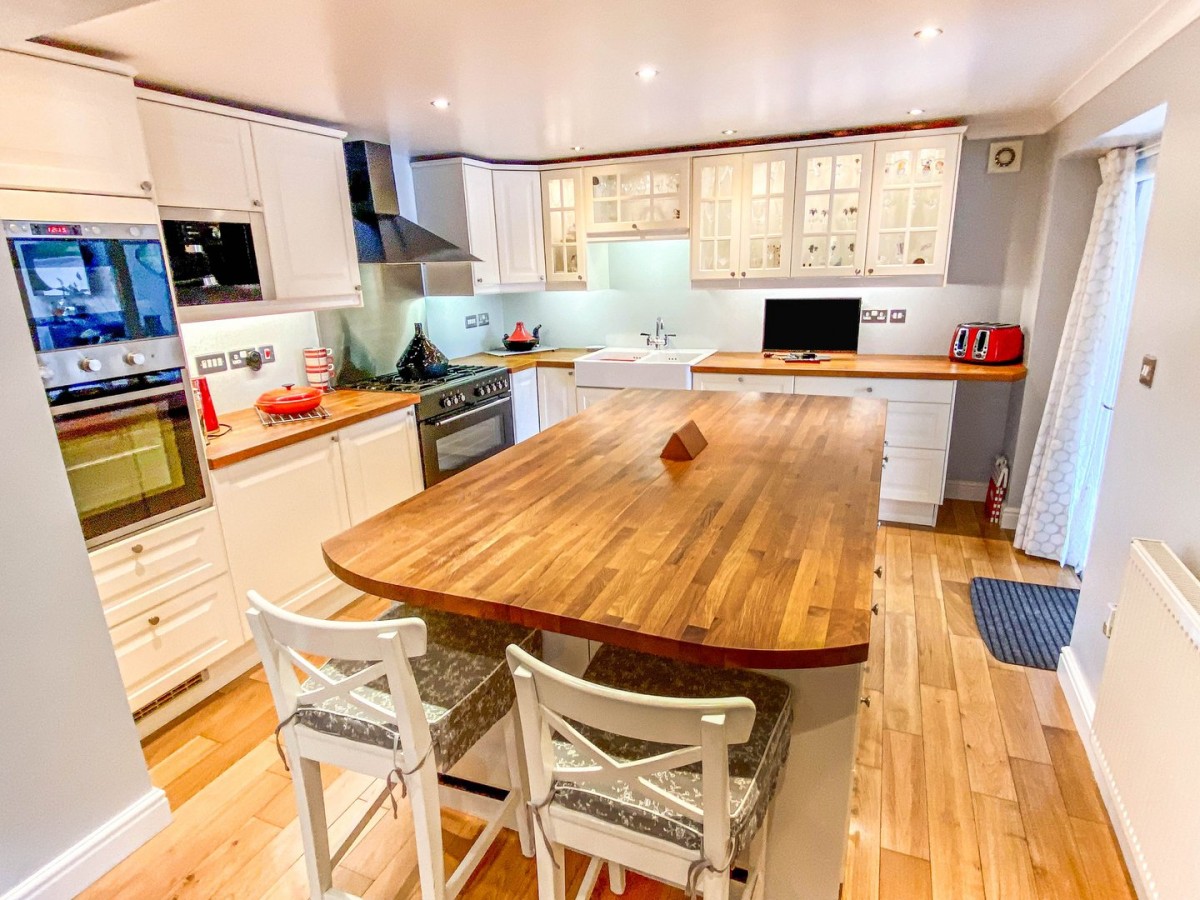 Tongue and groove clad ceiling with coving, ceiling light, part papered walls in a brick effect with ceramic tiling to splash back areas and a radiator. PVCu double glazed anthracite window overlooking the side aspect and tiled flooring. A range of wall and base units in solid wood with co-ordinating roll edge work surface and inset sink and drainer with mixer tap. Integrated dishwasher, oven with four ring gas hob and overhead extractor hood. Further display cabinets and breakfast bar. Staircase leads down with bi-fold door to the hallway.