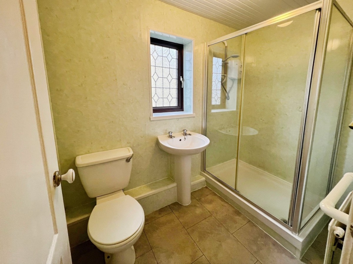 1.45m x 2.30m (4' 9" x 7' 7") PVCu tongue and groove ceiling, respertex walls, PVCu frosted double glazed window to the side of the property, radiator and vinyl flooring. Three piece suite comprising low level w.c. pedestal wash hand basin and shower cubicle with electric overhead shower and glass sliding doors.