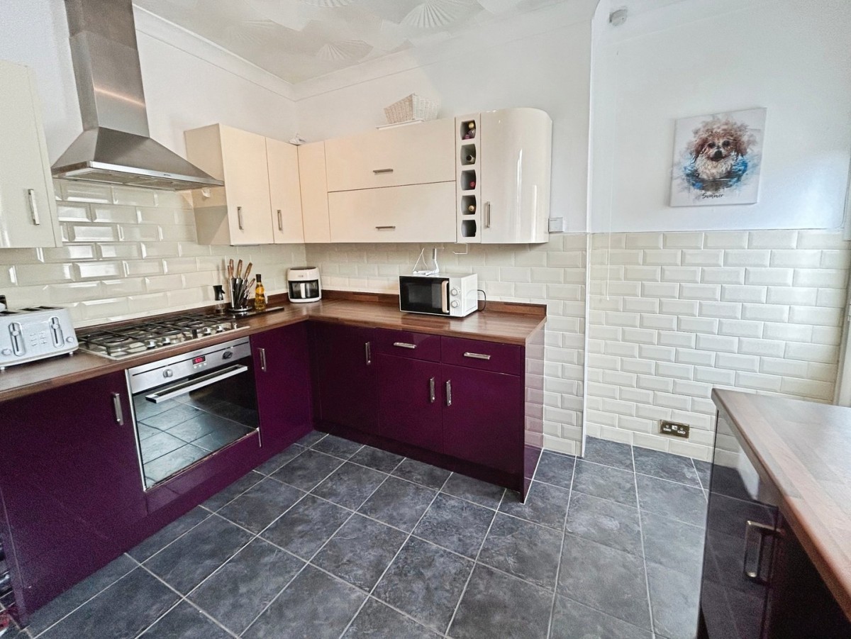 3.33m x 3.36m (10' 11" x 11' 0") Artexed and coved ceiling with track spot light fitting, half emulsioned / half ceramic tiled walls, ceramic tiled flooring, PVCu double glazed window to the rear of the property and half glazed PVCu double glazed door leading out to the rear garden. A range of purple and cream contrasting gloss wall and base units with complementary laminate worktops housing a one and half stainless steel sink and drainer with chrome hot and cold flex tap. Four ring built in gas hob with overhead stainless steel extractor hood and built in electric oven below. Under counter space for washing machine and fridge/freezer to remain.