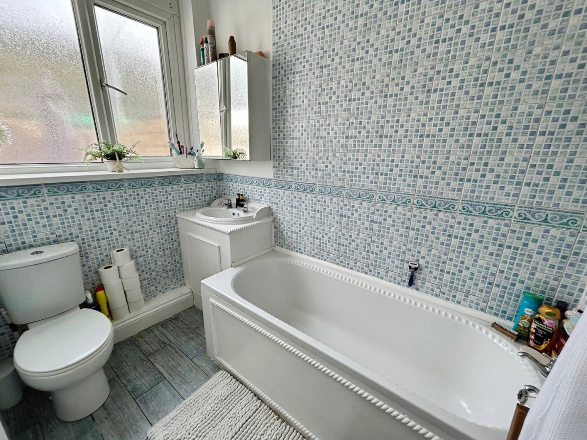 1.63m x 2.41m (5' 4" x 7' 11") Artexed and coved ceiling with flush light fitting, half emulsioned / half ceramic tiled walls, ceramic tiled flooring, radiator and frosted PVCu double glazed window to the rear of the property. Three piece suite in white comprising w.c. wash hand basin with chrome hot and cold taps set within a painted vanity unit and bath with chrome hot and cold taps and wall mounted electric Triton shower with shower curtain and rail.