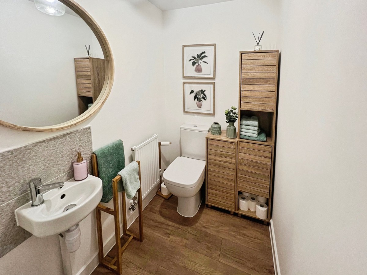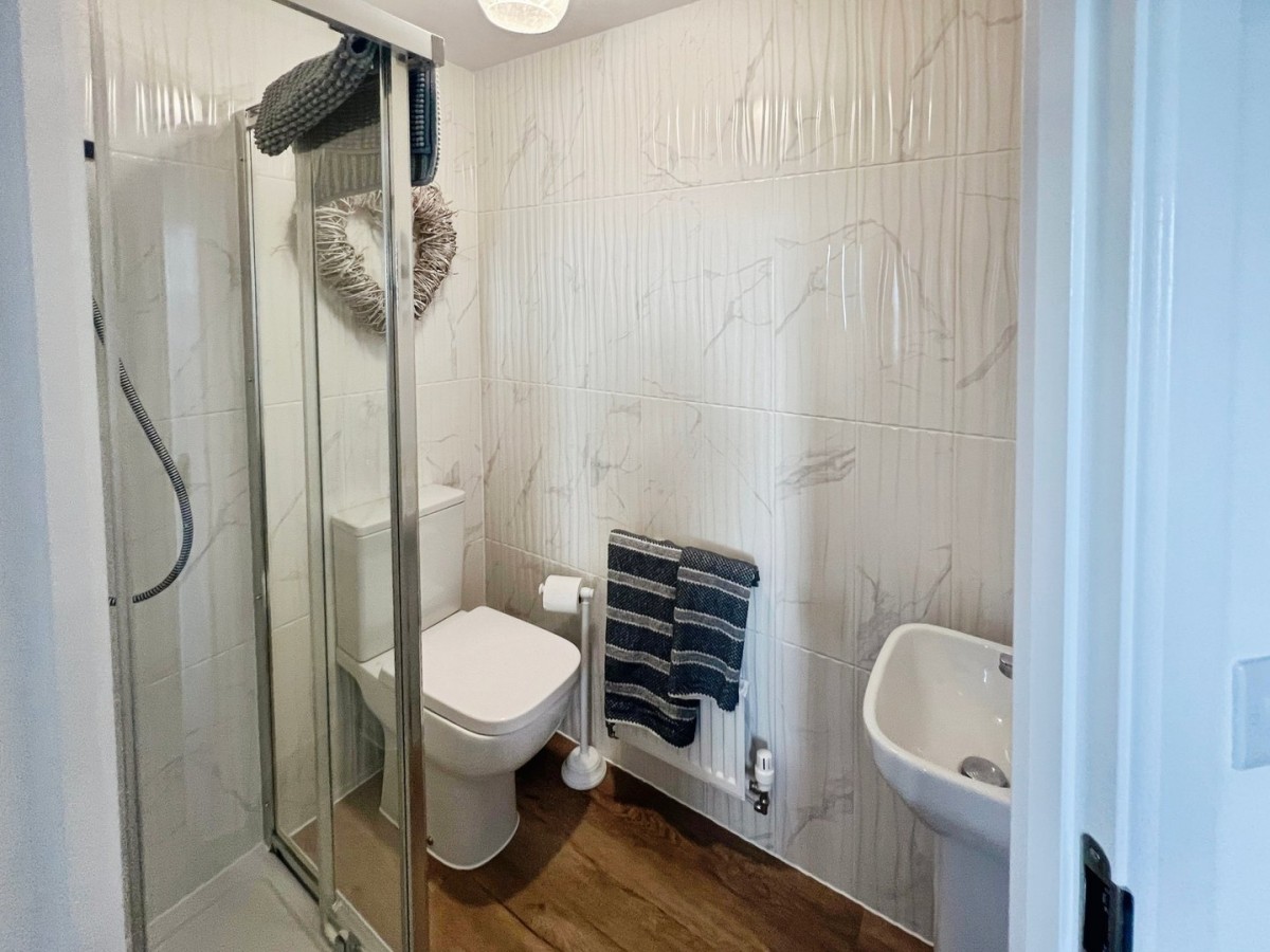 1.49m x 1.77m (4' 11" x 5' 10") Emulsioned ceiling with extractor fan, floor to ceiling tiled walls, radiator and wood effect laminate flooring. Three-piece suite comprising low-level WC, pedestal wash hand basin and shower cubicle with a chrome mains shower and glass sliding door.