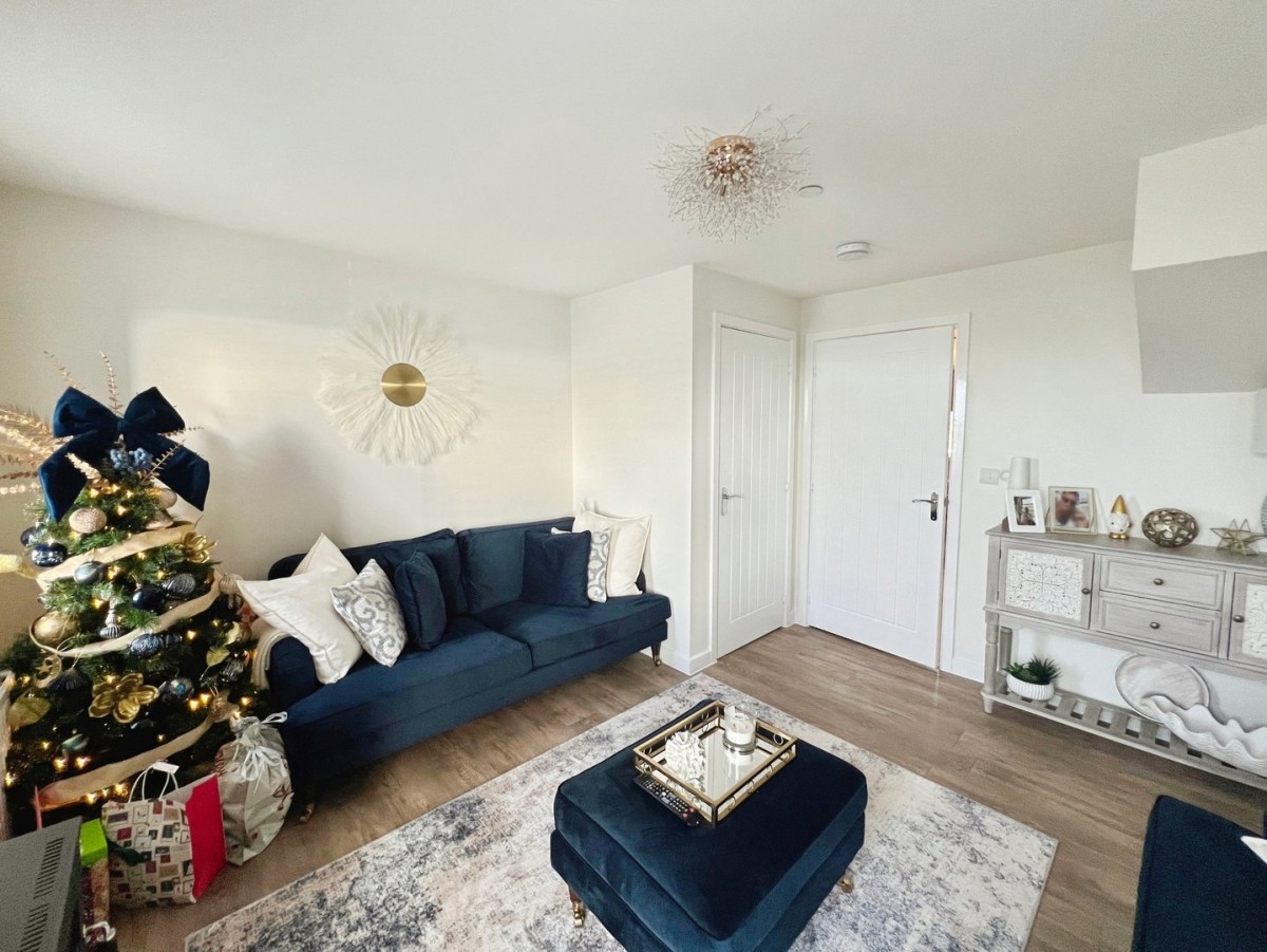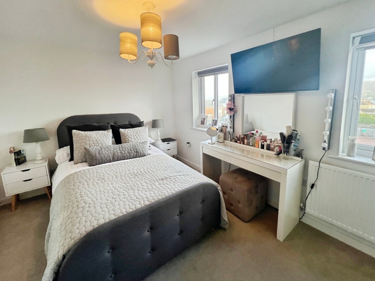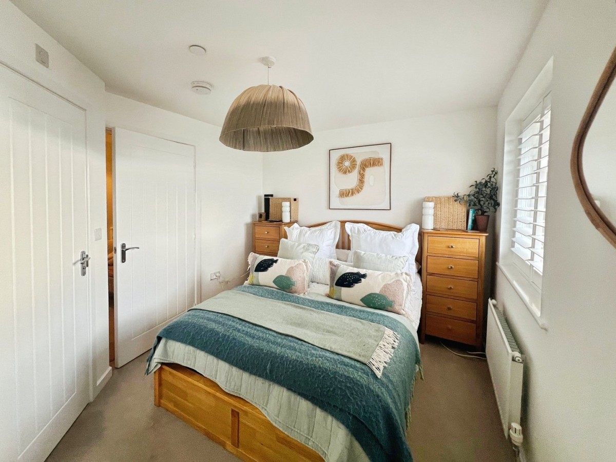 3.82m x 3.97m (12' 6" x 13' 0") Emulsioned ceiling and walls, PVCu double glazed window overlooking the front of the property, PVCu double glazed patio doors leading out to a glass Juliet balcony overlooking the front of the property, radiator and wood effect vinyl flooring. Cupboard into over stair storage.