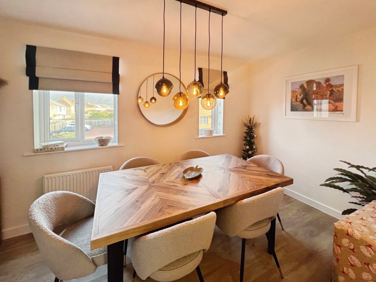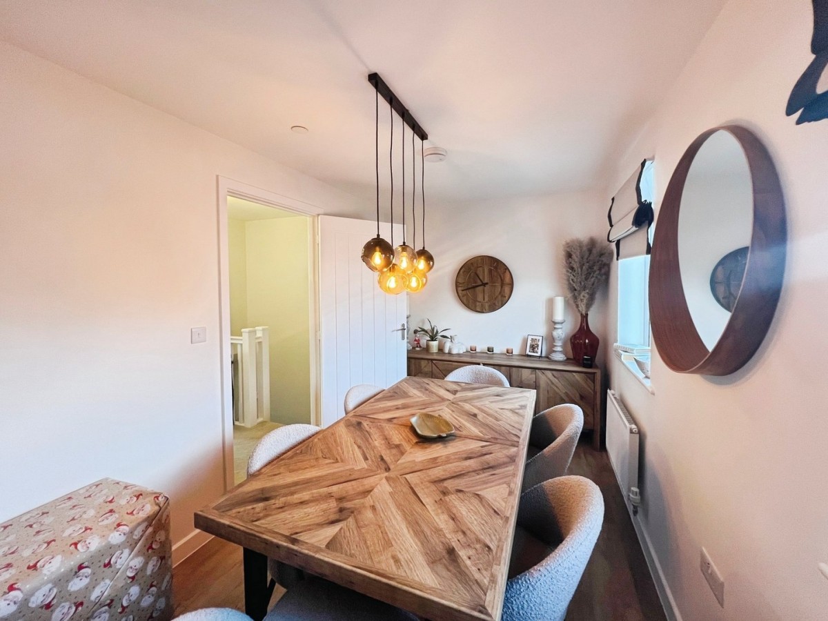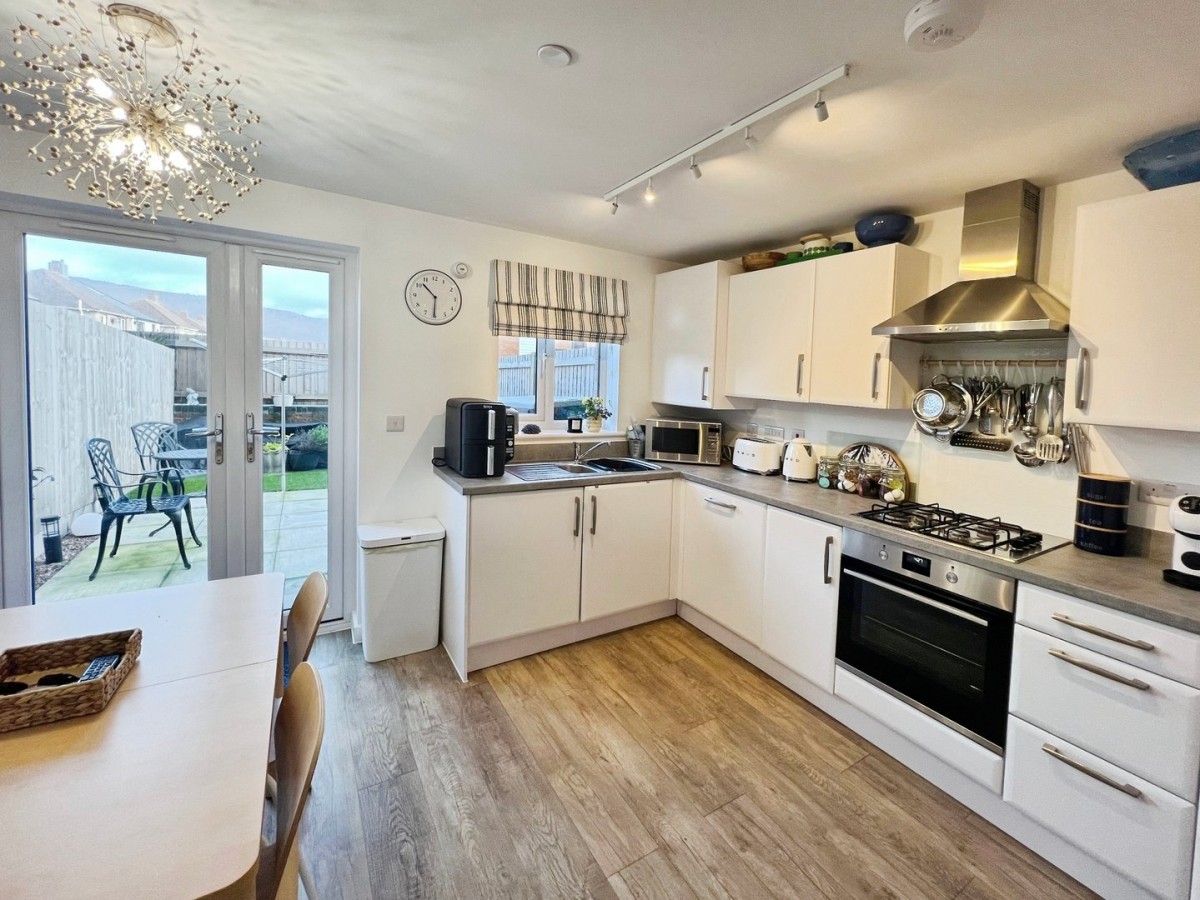 3.29m x 3.96m (10' 10" x 13' 0") Emulsioned ceiling and walls, PVCu double glazed window overlooking the rear of the property and PVCu French doors leading out to the rear garden, radiator and a continuation of the vinyl flooring. The Kitchen is fitted with a range of wall and base units with complementary work surface. Integrated kitchen appliances include fridge freezer, dishwasher and washing machine. Inset four ring gas hob with stainless steel extractor hood above and oven below. Inset one and a half stainless steel sink and drainer. Space for dining furniture. Wall cupboard housing the gas fired combination boiler and door into under stair storage cupboard.