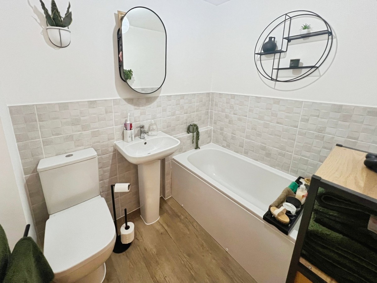 1.78m x 2.09m (5' 10" x 6' 10") Emulsioned ceiling with extractor fan, part emulsioned/ part tiled walls. radiator and wood effect vinyl flooring. Three-piece suite comprising low-level WC, pedestal wash hand basin and panelled bath with chrome tap.