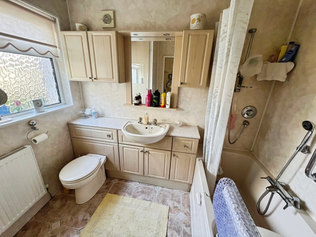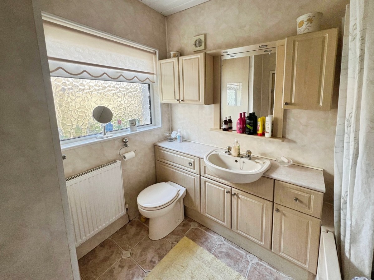 2.01m x 2.44m (6' 7" x 8' 0") PVCu tongue and groove ceiling, respertex walls, PVCu double glazed window to the side, radiator and tiled flooring. Three piece suite comprising w.c. and wash hand basin set within vanity storage unit and panelled walk in bath with chrome handheld shower attachment with overhead mains fed shower. Door into storage unit housing the wall mounted combination gas fired boiler.