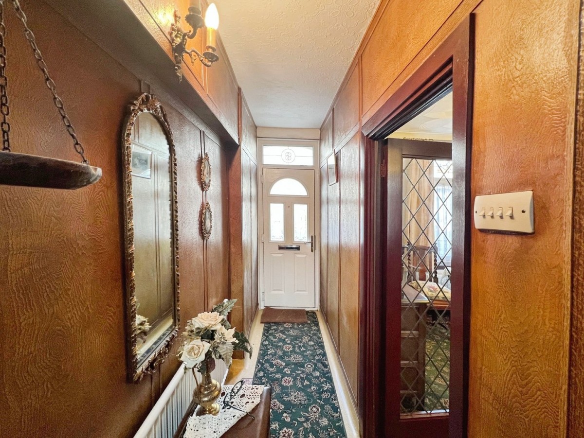 Papered ceiling, panel effect wallpaper, radiator, tiled flooring and stairs leading to the first floor with stair lift to remain. Door leading to ground floor accommodation.