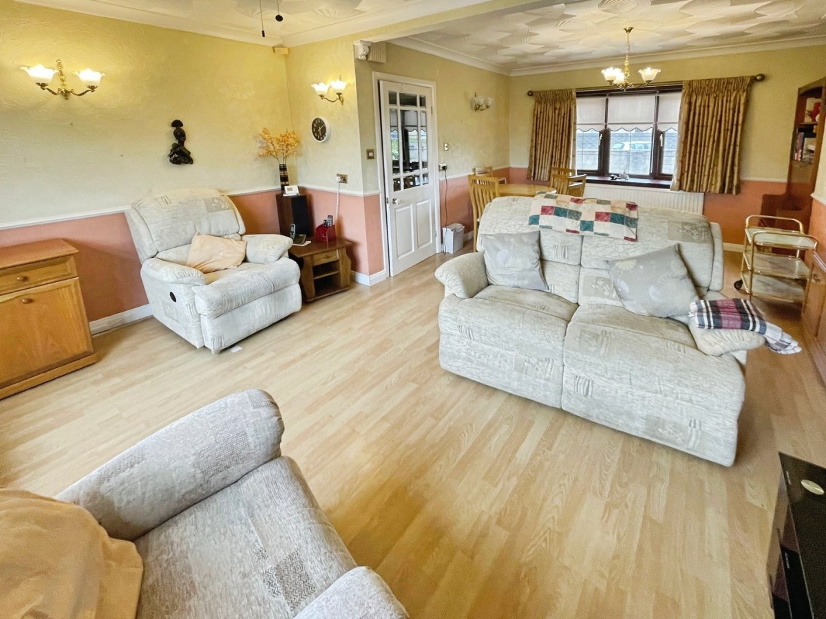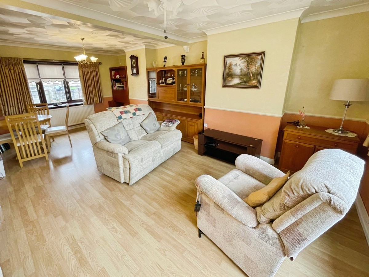 6.4m x 5.60m (21' 0" x 18' 4") max. PVCu double glazed windows to the front and rear, two radiators, laminate flooring, coving, papered walls with dado rail, artexed ceiling and three wall lights.
