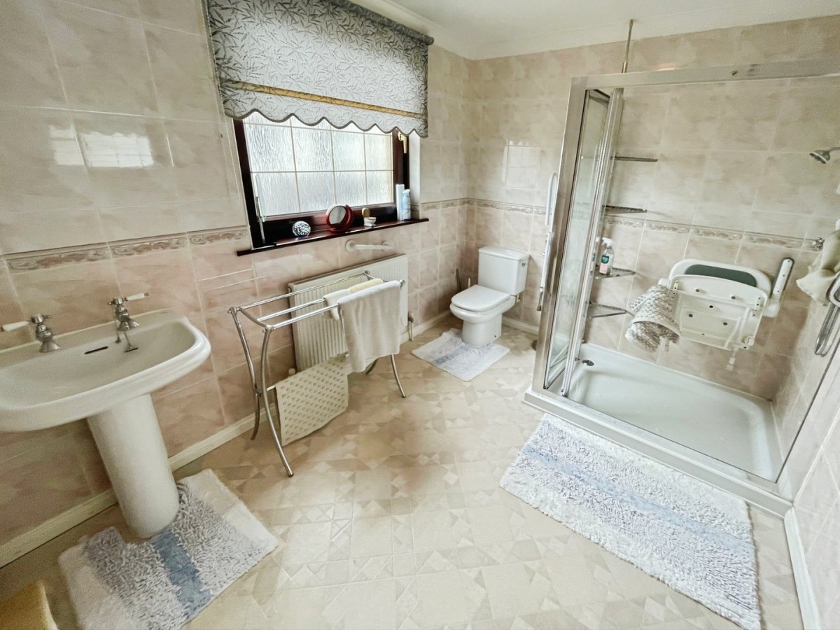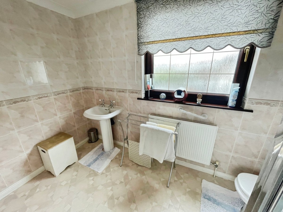2.33m x 3.13m (7' 8" x 10' 3") PVCu double glazed opaque window overlooking the rear, radiator, vinyl flooring and floor to ceiling ceramic tiled walls. Three piece suite comprising pedestal wash hand basin, low level WC and double sized shower cubicle with bi-fold glass door and mains powered shower attachment.