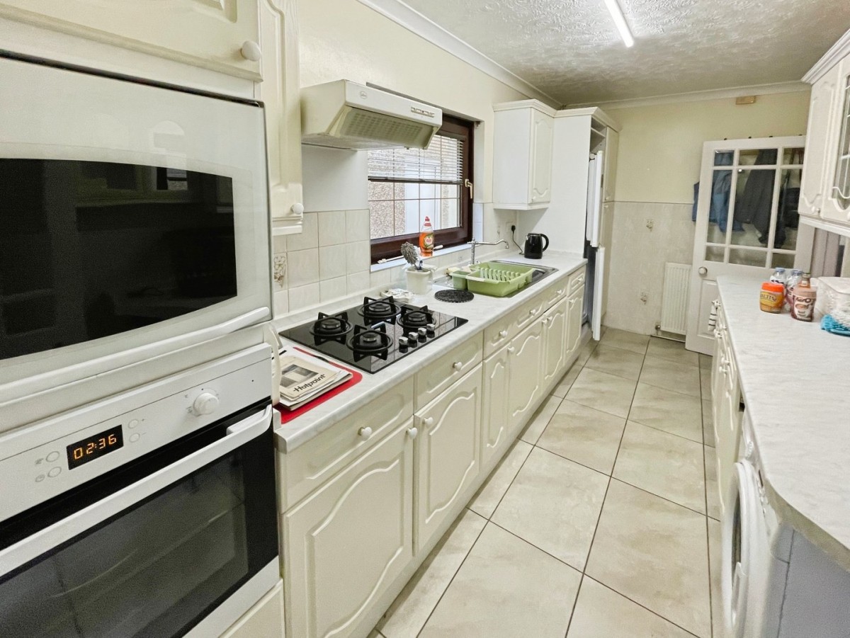 2.12m x 4.54m (6' 11" x 14' 11") PVCu double glazed window to the side, radiator, part tiled / part emulsioned walls and ceramic tiled flooring. A range of matching wall and base units with complementary roll edge work surfaces housing a stainless steel sink with single drainer and mixer tap. Gas hob, electric oven, recess space for microwave to be fitted and space for fridge/freezer. Timber framed glazed door leading to the rear lobby.