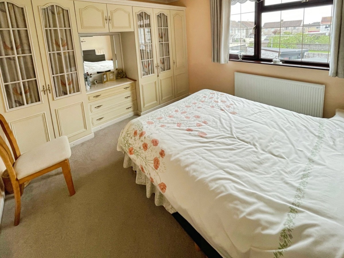 3.37m x 3.12m (11' 1" x 10' 3") measurements exclude the wardrobes. A range of fitted wardrobes with overhead storage and vanity mirror. Artexed and coved ceiling, papered walls, radiator, fitted carpet and PVCu double glazed window to the front.
